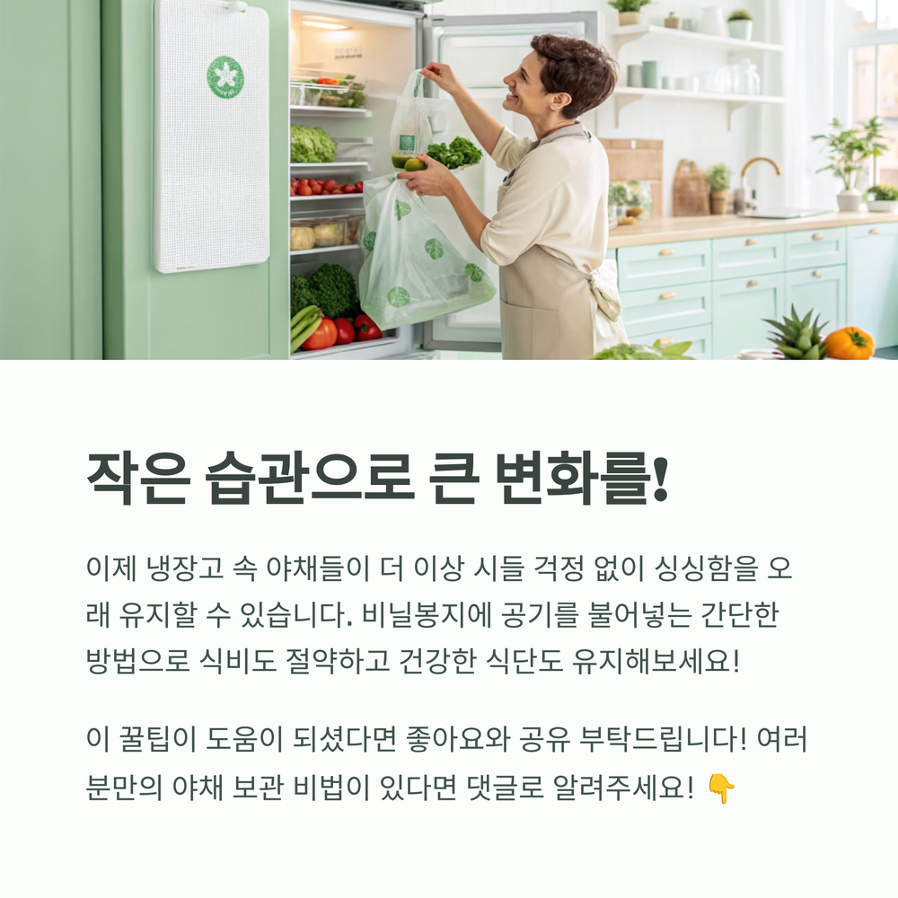 냉장고 야채 칸에 시들어가거나 무른 야채가 있으면 괜히 마음이 불편하고 버릴 때마다 아깝다는 생각이 들잖아요. 이 비닐봉지 공기 보관법은 정말 간단하지만 효과는 뛰어난 방법이니 꼭 한번 시도해보셨으면 좋겠어요.