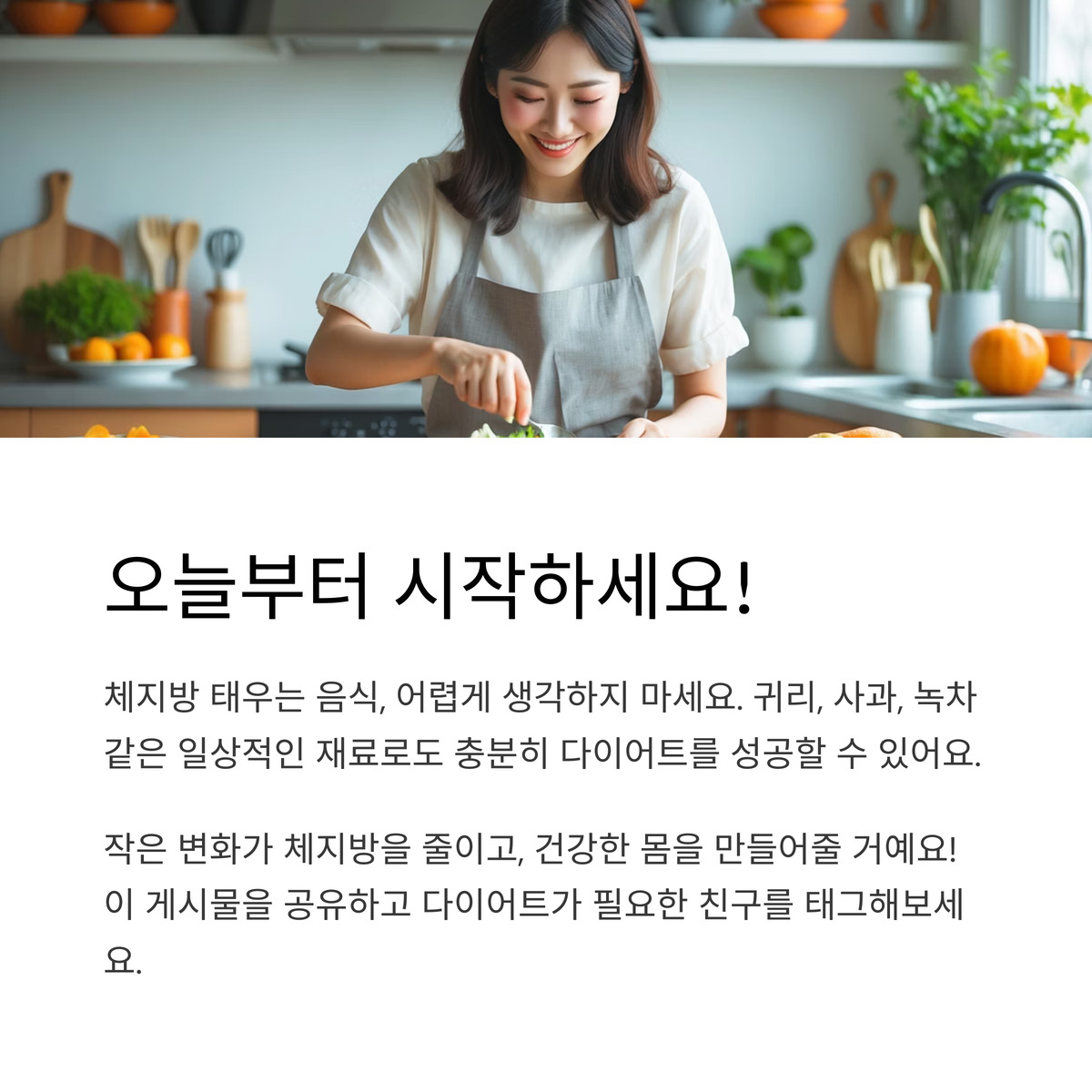 냉장고를 열고 토마토나 요구르트를 꺼내 간단히 시작해보세요. 작은 변화가 체지방을 줄이고, 건강한 몸을 만들어줄 거예요!