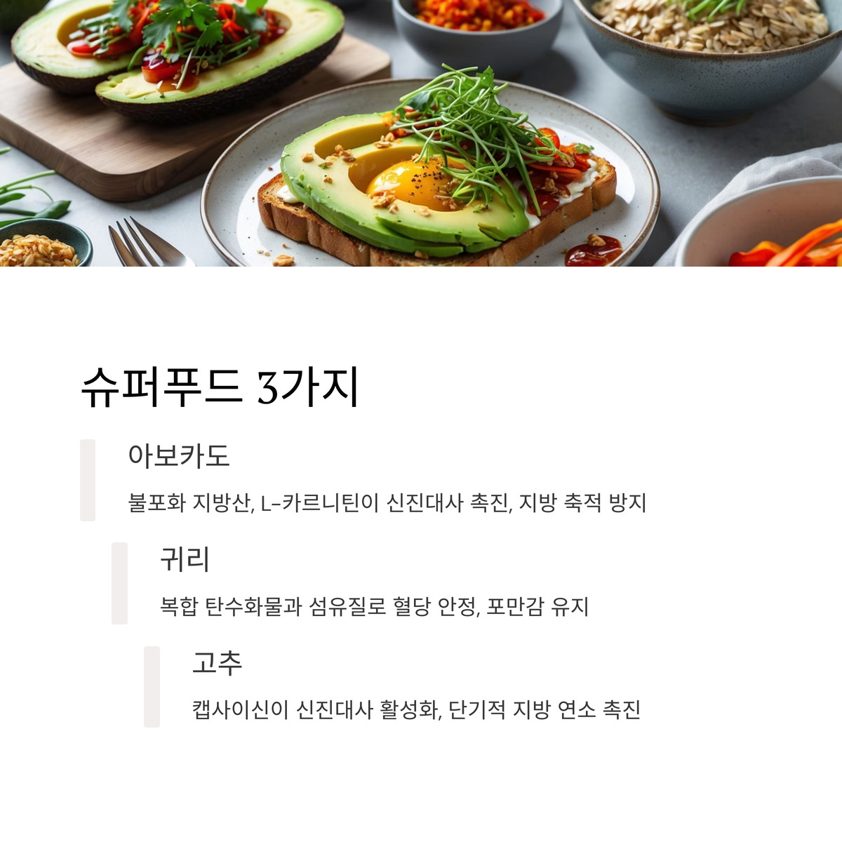 아보카도는 불포화 지방산이 풍부해 체지방 태우는 음식으로 사랑받아요. L-카르니틴과 매노헵툴로스가 신진대사를 촉진하고, 지방 축적을 막아주죠. 게다가 포만감이 커서 과식을 줄여준답니다.