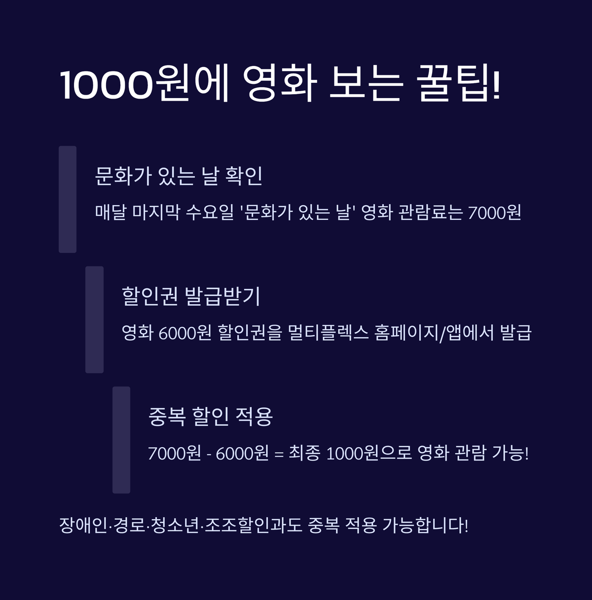 - 핵심 꿀팁: 장애인/경로/청소년/조조 할인 등 다른 혜택과 중복 할인 가능! 특히 '문화가 있는 날'에는 1000원에 영화 관람 가능.