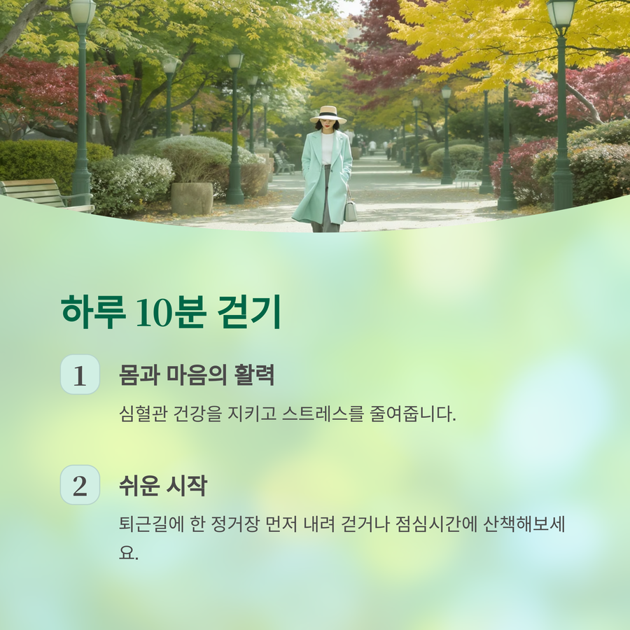 하루 10분 걷기는 심혈관 건강을 지키고 기분을 상쾌하게 해주는 좋은 습관이에요. 걷기는 스트레스를 줄이고, 체중 관리에도 도움을 주죠. 퇴근길에 한 정거장 먼저 내려 걷거나 점심시간에 동네를 한 바퀴 돌아보세요.