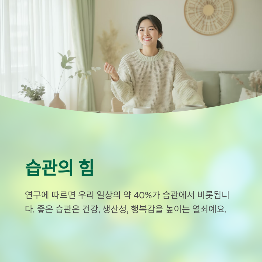 매일 반복하는 작은 행동이 삶을 결정해요. 연구에 따르면, 우리가 매일 하는 행동의 약 40%가 습관에서 비롯되죠. 좋은 습관은 건강, 생산성, 행복감을 높이는 열쇠예요.