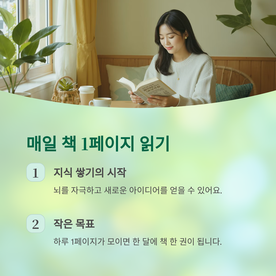 책 읽기는 뇌를 자극하고 새로운 아이디어를 얻는 좋은 습관이에요. 바쁘다면 하루 1페이지부터 시작해보세요. 작은 시작이 쌓이면 한 달에 책 한 권을 읽게 될 거예요.