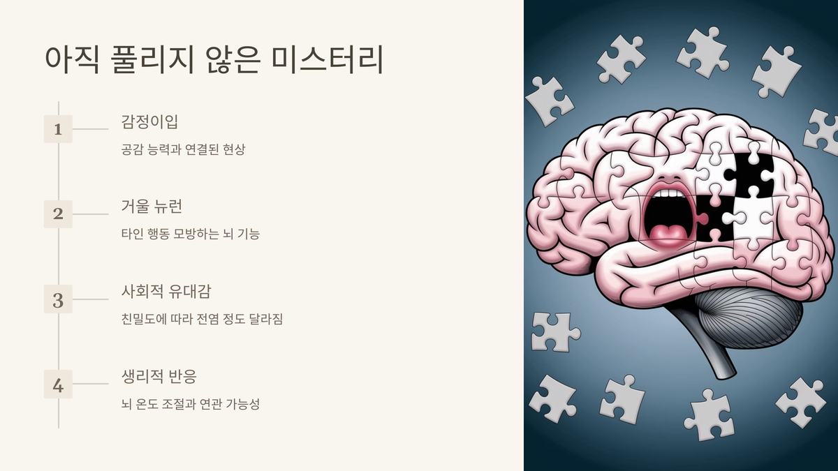 아직 하품이 왜 전염되는지 완전히 풀리진 않았어요. 과학자들은 계속 연구 중이고, 앞으로 더 많은 비밀이 밝혀질 거예요. 그래도 지금까지의 발견을 보면, 하품은 뇌와 감정, 사회적 관계가 얽힌 신비로운 퍼즐 같아요.