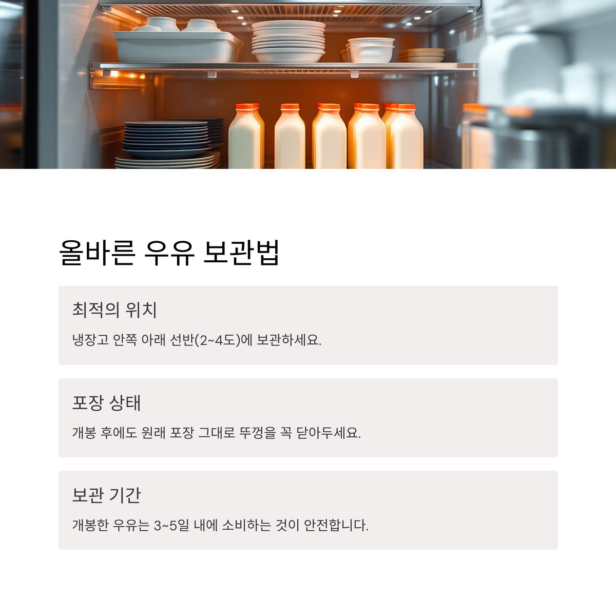 개봉한 우유는 뚜껑을 꼭 닫고, 원래 포장 상태로 보관하세요. 공기나 습기가 들어가면 박테리아가 번식하기 쉬워요. 3~5일 안에 마시는 게 가장 안전하답니다.