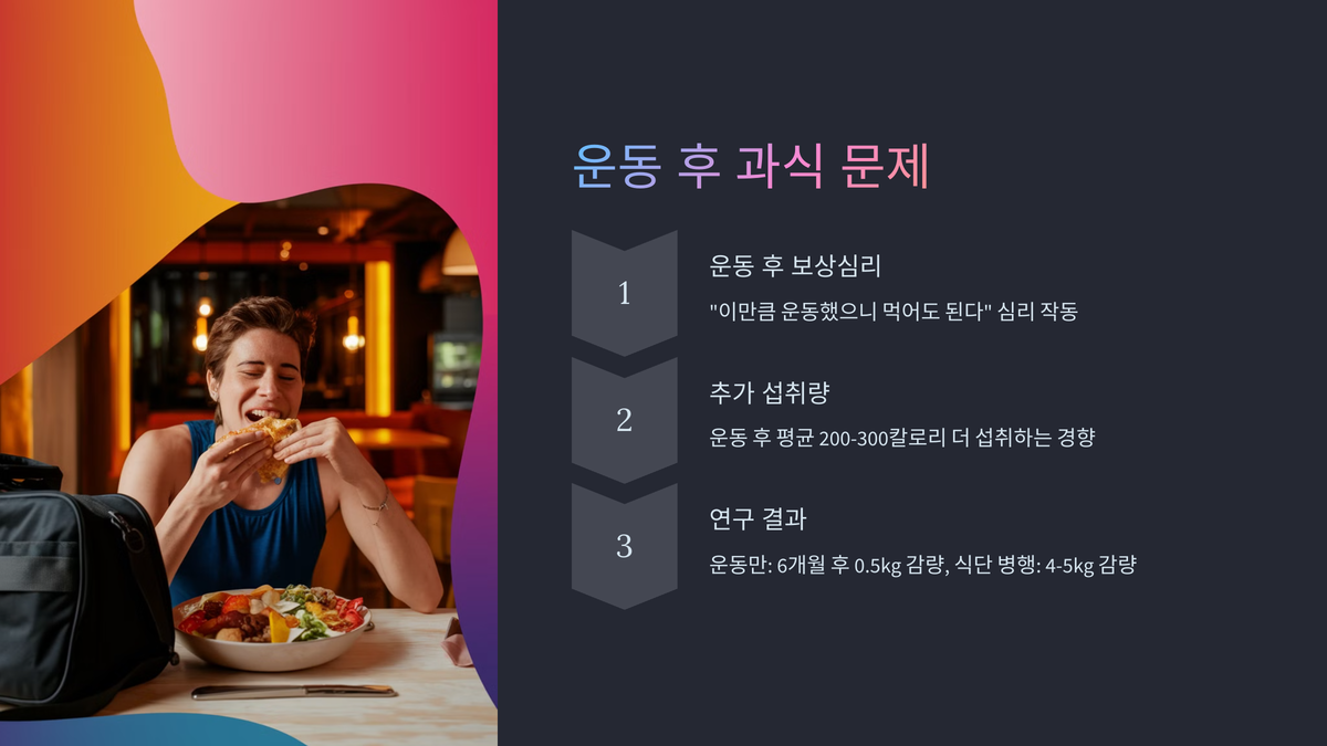 이건 심리적인 부분도 커요. “운동했으니 좀 먹어도 돼”라는 보상 심리가 작동하면서 식욕이 더 커질 수 있거든요. 미국 인디애나대 연구(2022년)에서도 운동만으로 체중 감량을 시도한 사람들은 6개월 후 평균 0.5kg만 빠졌다고 해요. 반면 식단을 같이 조절한 그룹은 4~5kg 감량에 성공했죠. 그러니까 운동만 믿고 먹는 걸 방치하면 살 빼기 힘들다는 게 명확해요.