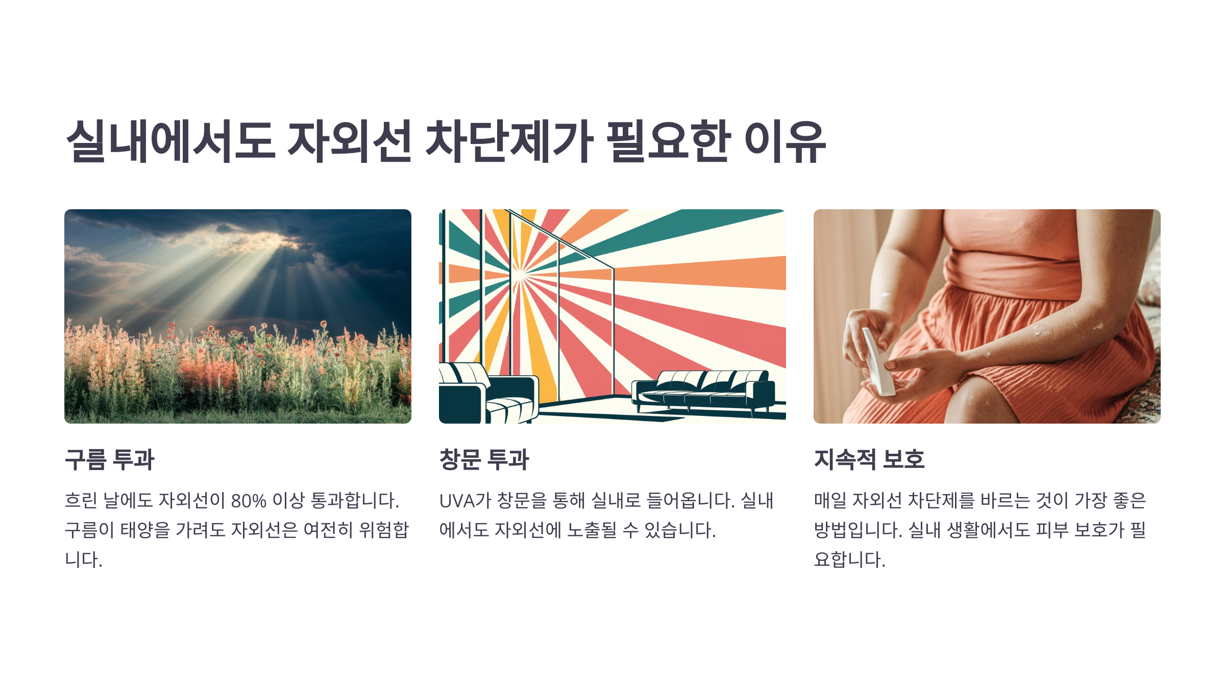 - 실내에서도 자외선이 유입된다. 창문을 통해 UVA가 들어와 피부 깊숙이 영향을 미칠 수 있다.