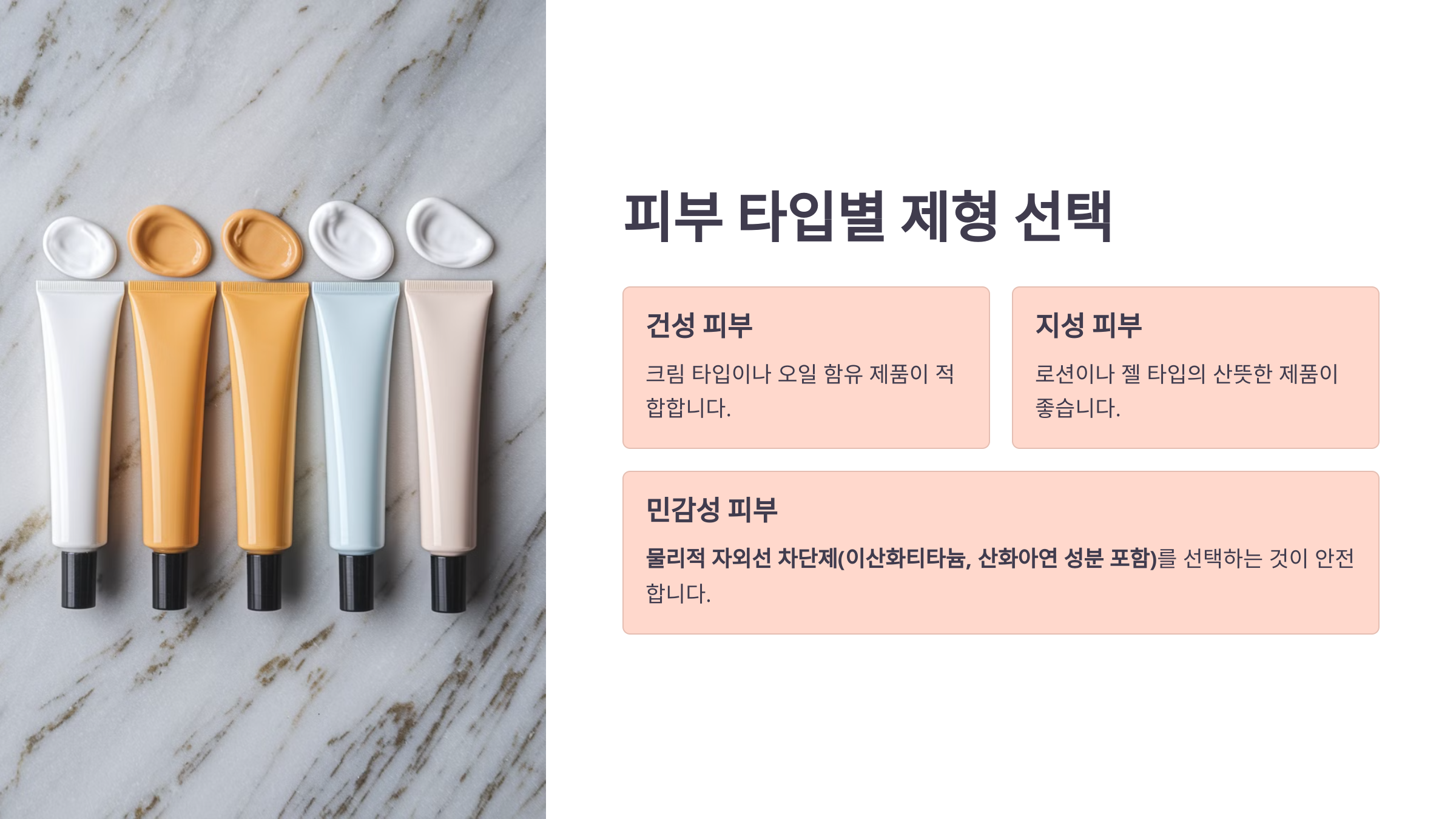 - 민감성 피부: **물리적 자외선 차단제(이산화티타늄, 산화아연 성분 포함)**를 선택하는 것이 안전하다.