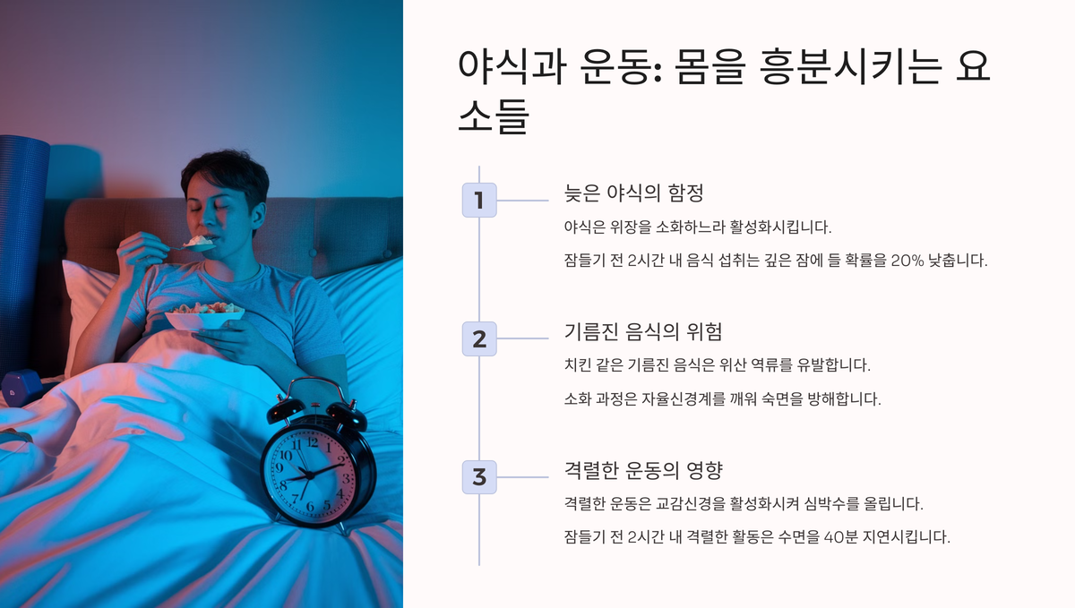 특히 기름진 음식이나 매운 음식은 위산 역류 유발해 더 문제예요. 예를 들어, 치킨 먹고 바로 눕기 힘든 이유가 이거죠. 소화 과정은 자율신경계를 깨워 숙면 막아요. “배고프면 잠이 안 오지 않나?”라는 생각 바로잡아드릴게요. 배고픔은 참아도 되지만, 소화는 잠을 방해해요!