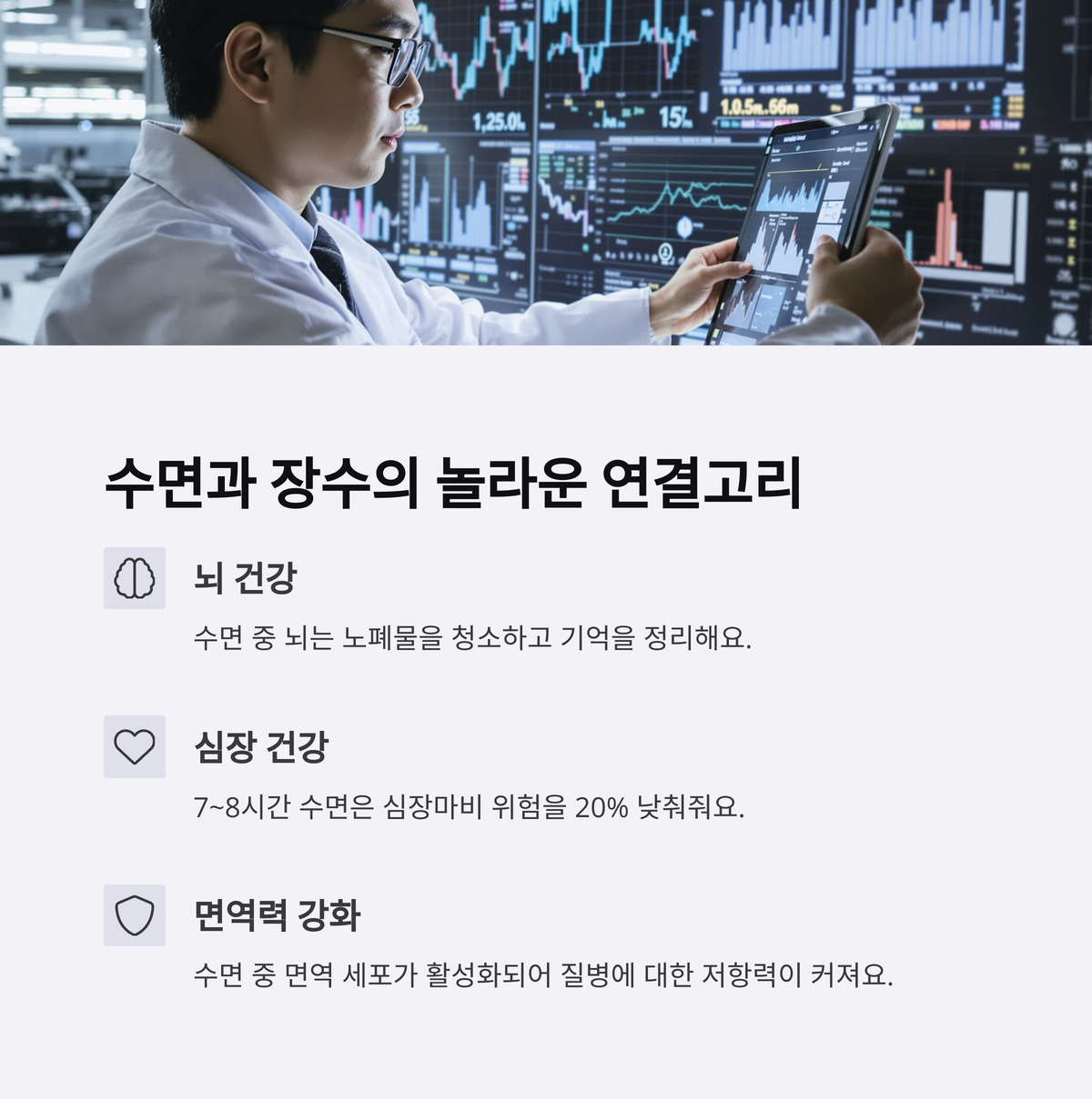 수면은 장수의 열쇠예요. 규칙적인 취침 시간, 양질의 숙면, 건강한 수면 환경은 심장, 뇌, 면역력을 지키며 수명을 늘려주죠. 작은 습관 변화로 큰 효과를 볼 수 있어요.