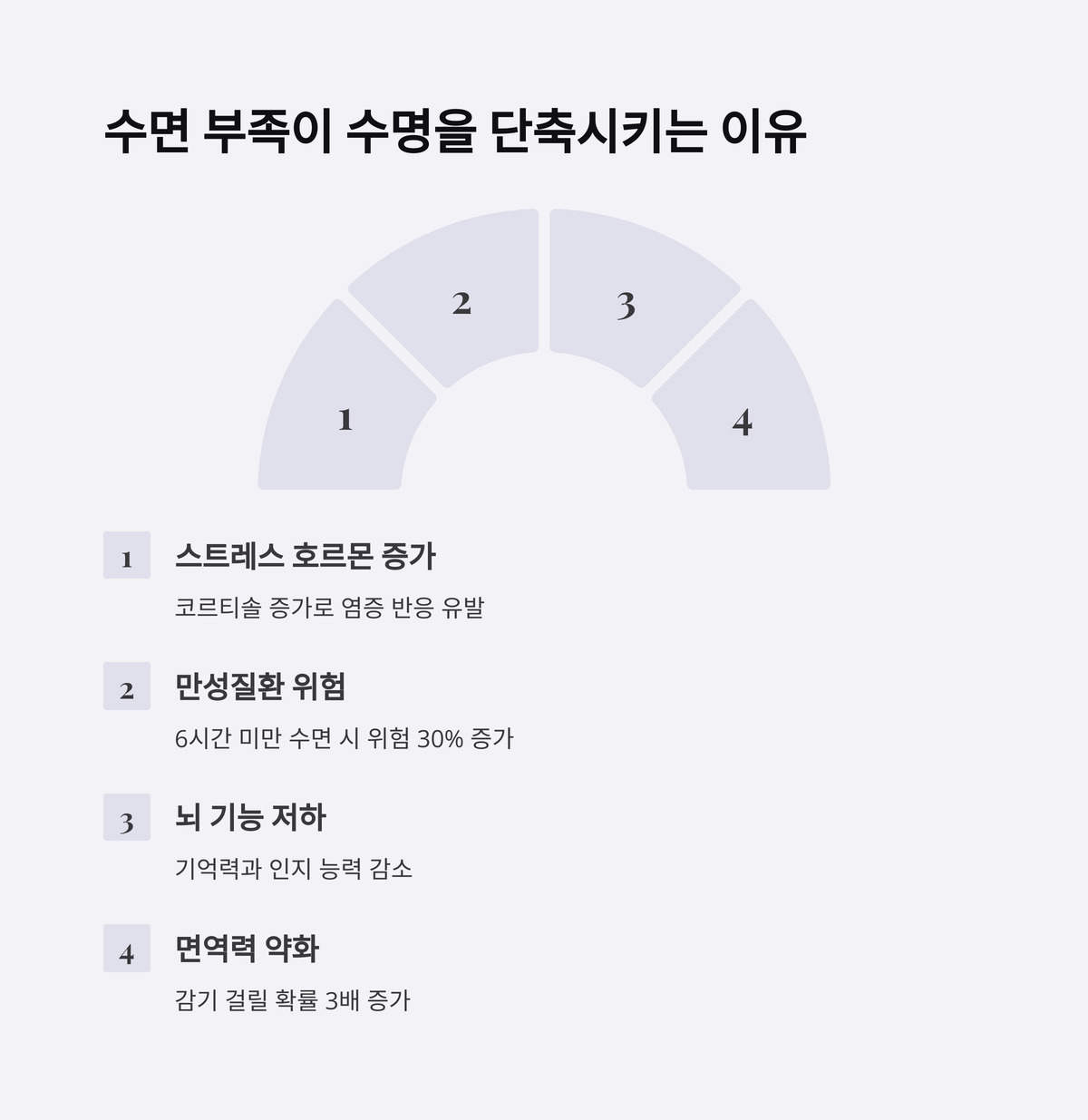 잠을 적게 자면 몸에 무리가 가요. 수면 부족은 스트레스 호르몬인 코르티솔을 증가시켜 염증 반응을 일으키죠. 이는 비만, 당뇨, 심장 질환 위험을 높여요.