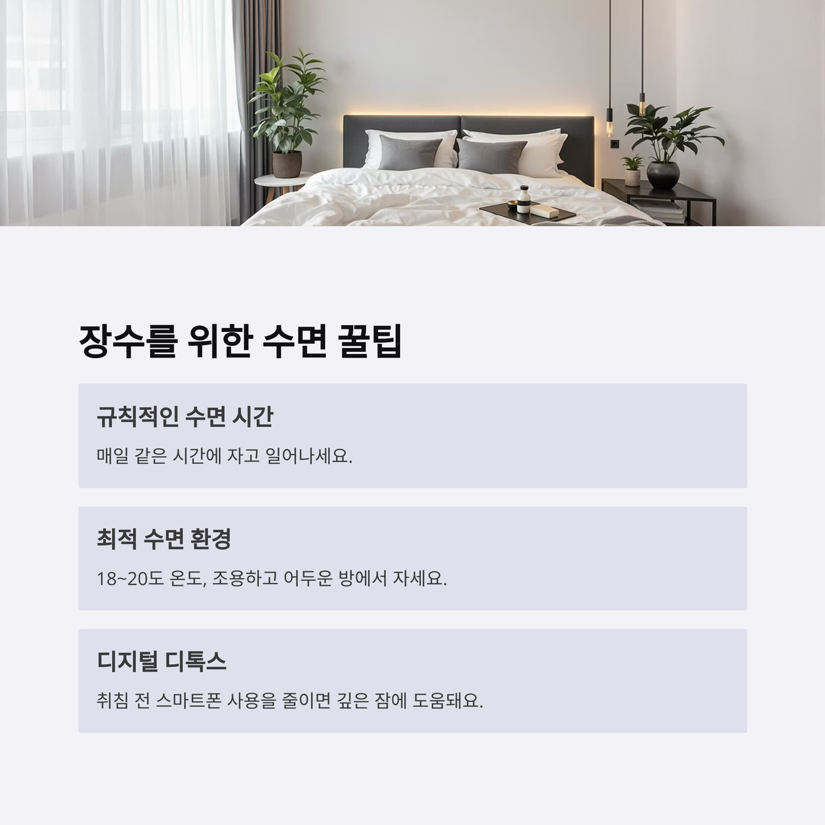 수면은 장수의 열쇠예요. 규칙적인 취침 시간, 양질의 숙면, 건강한 수면 환경은 심장, 뇌, 면역력을 지키며 수명을 늘려주죠. 작은 습관 변화로 큰 효과를 볼 수 있어요.
