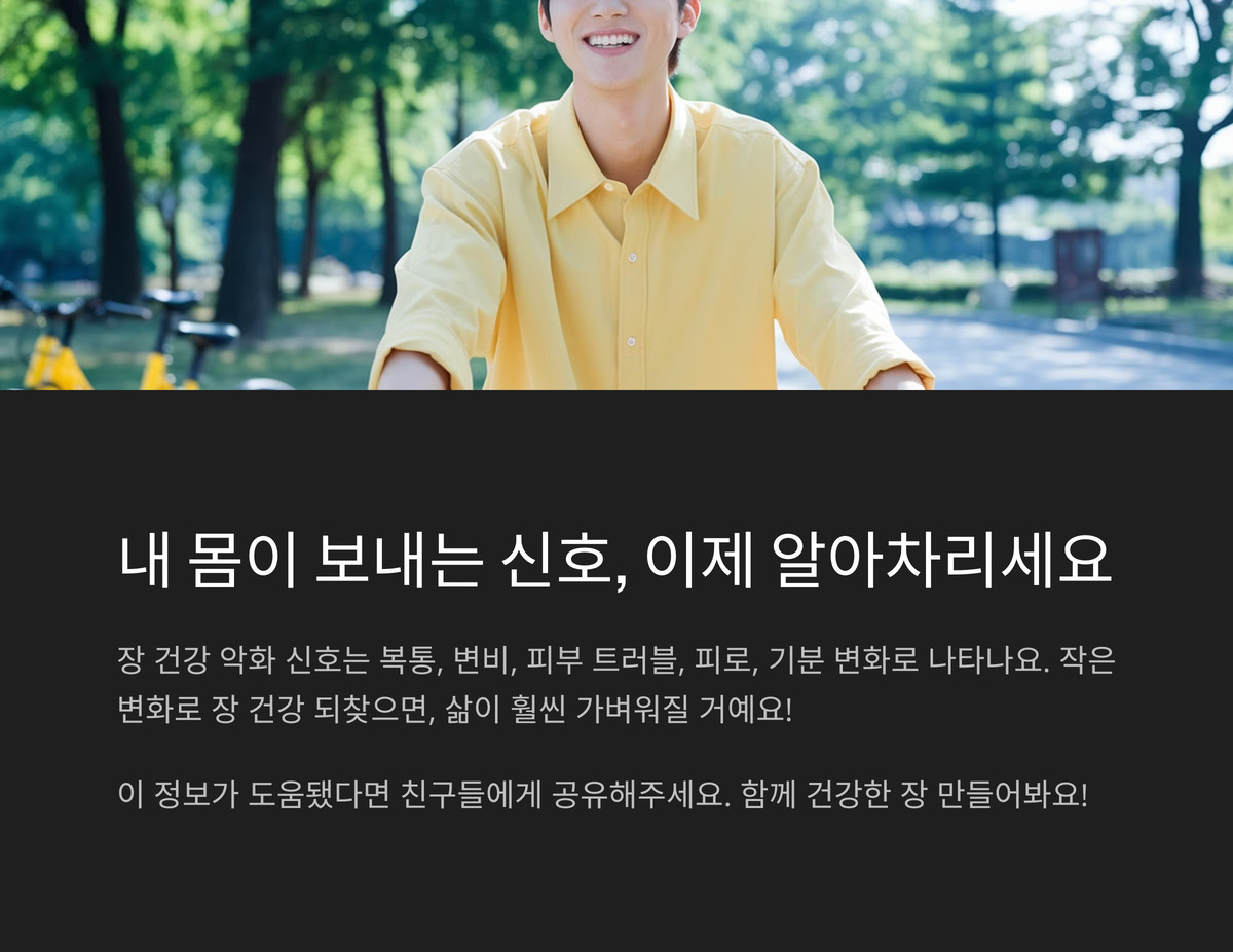 오늘부터라도 내 몸이 보내는 소리에 귀 기울여보세요. 작은 변화로 장 건강 되찾으면, 삶이 훨씬 가벼워질 거예요!