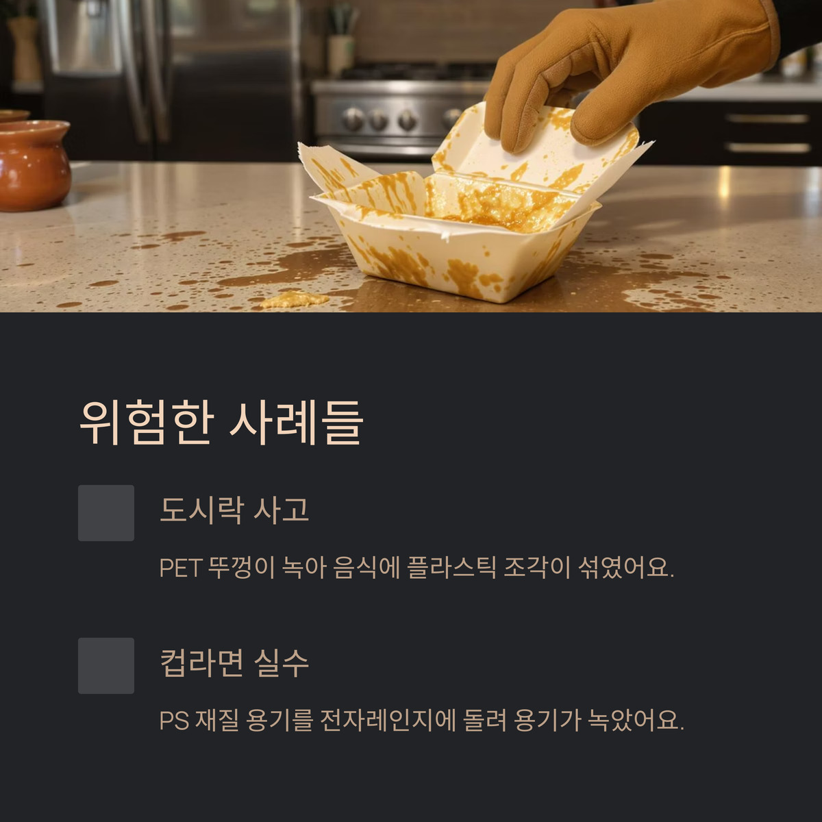 얼마 전 지인이 편의점 도시락을 PP 재질 용기라고 생각하고 전자레인지에 돌렸다가 낭패를 봤어요. 뚜껑이 PET 재질이었던 거예요. 3분쯤 돌리니 뚜껑이 녹아서 음식에 플라스틱 조각이 섞였고, 결국 다 버려야 했죠. 다행히 큰 사고로 이어지진 않았지만, 이 경험 덕분에 지인은 이제 용기 바닥의 마크를 꼼꼼히 확인한대요. 이런 사례는 우리 주변에서도 흔히 일어날 수 있어요. 특히 배달음식 용기는 PS나 PET 재질이 많으니, 전자레인지에 돌리기 전에 반드시 재질을 확인해야 해요.