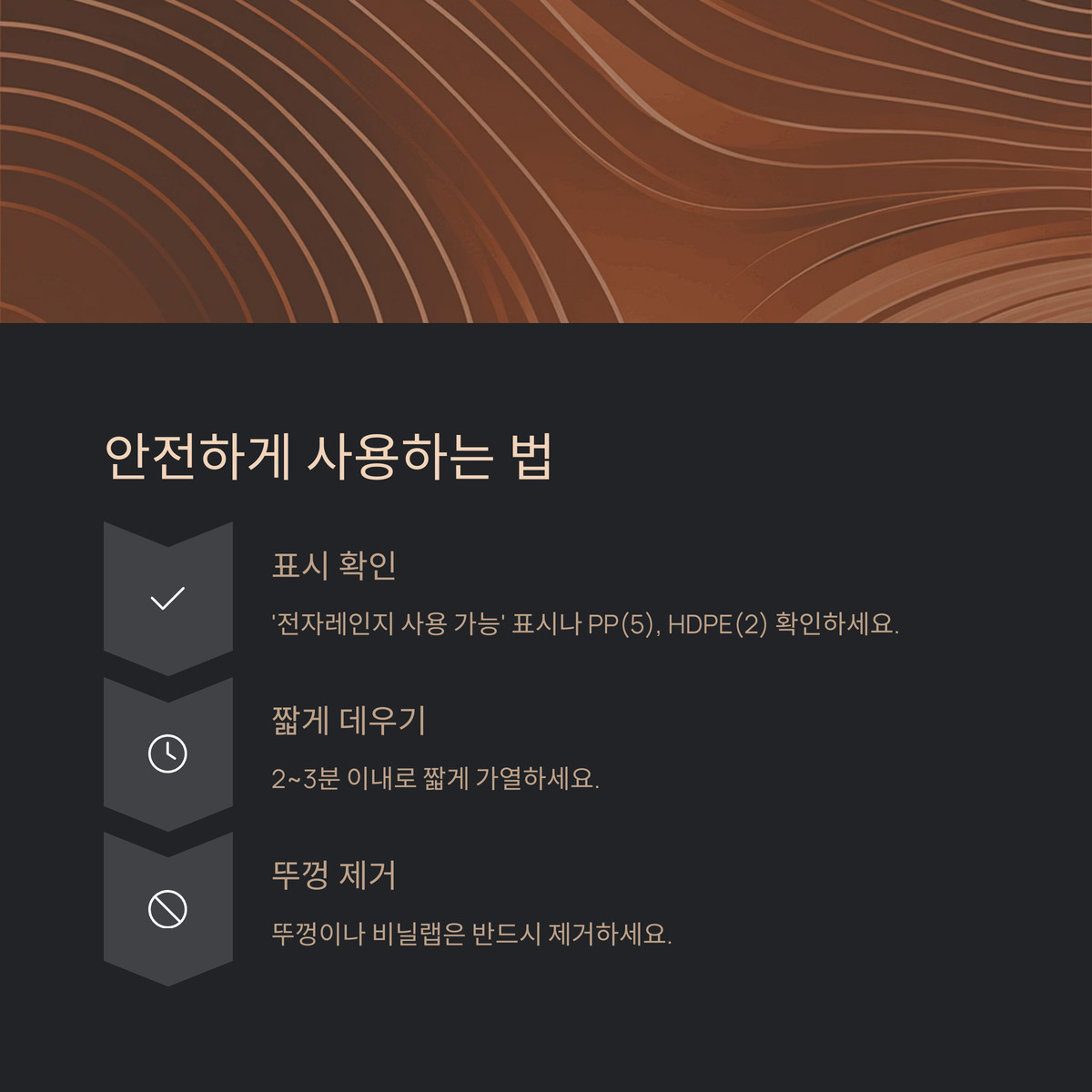 플라스틱 용기를 전자레인지에 사용할 때는 뚜껑을 열거나 제거하고, 데우는 시간은 2~3분 이내로 짧게 유지하세요. 장시간 가열은 용기 변형과 유해물질 배출 위험을 높입니다!