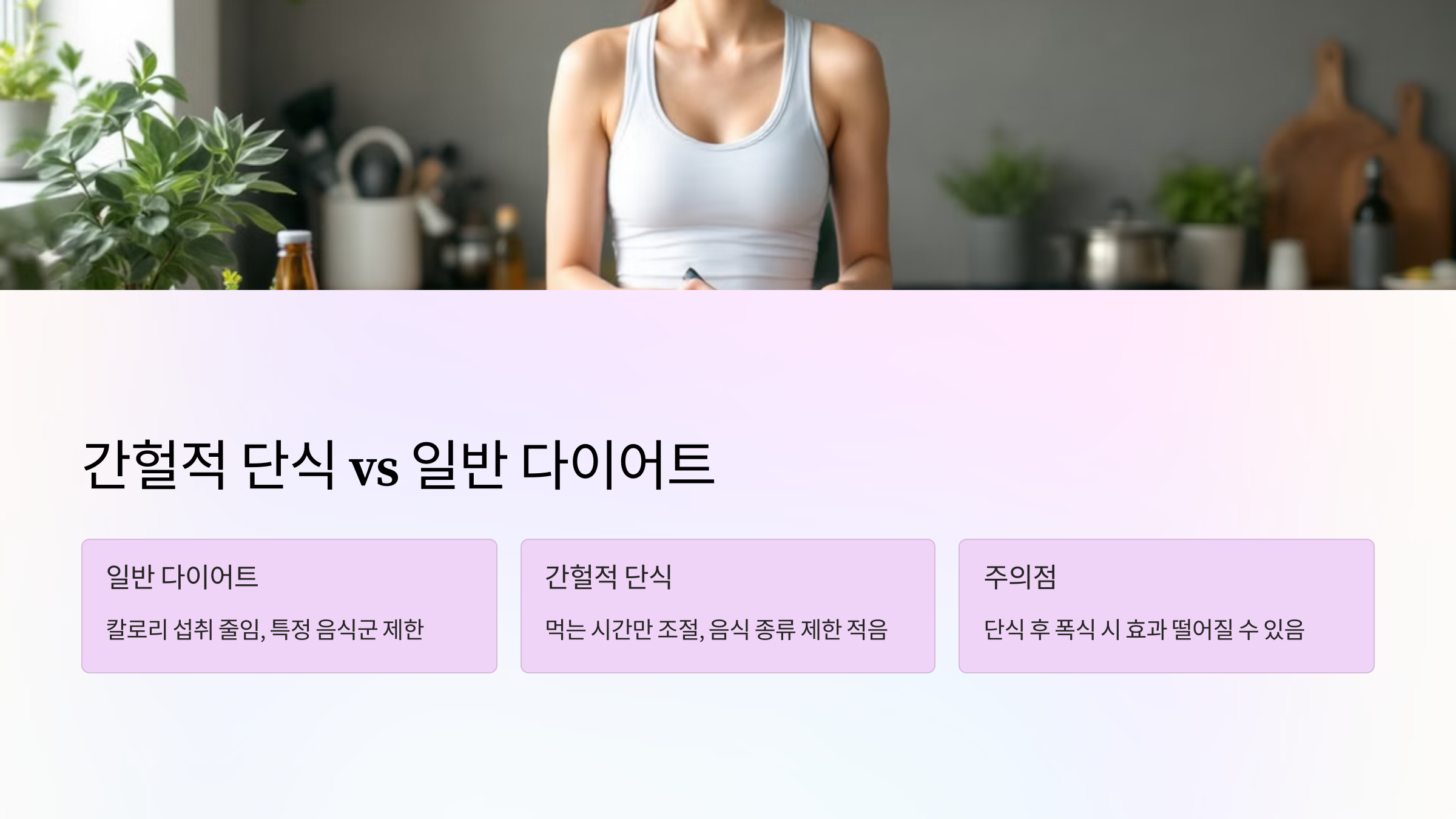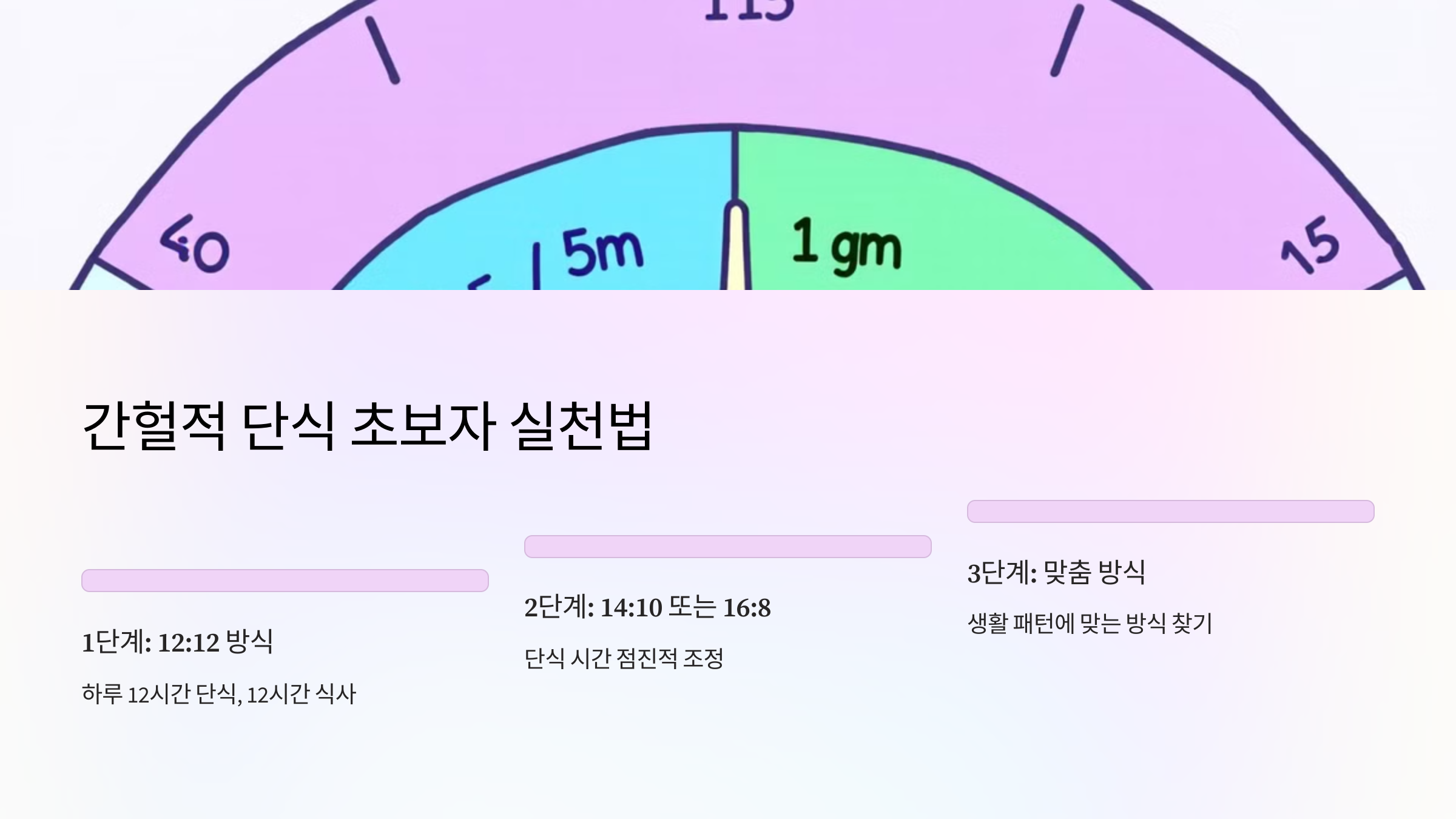 Tip: 직장인들은 너무 길게 단식하는 것보다 16:8 또는 14:10이 현실적으로 적합해요.