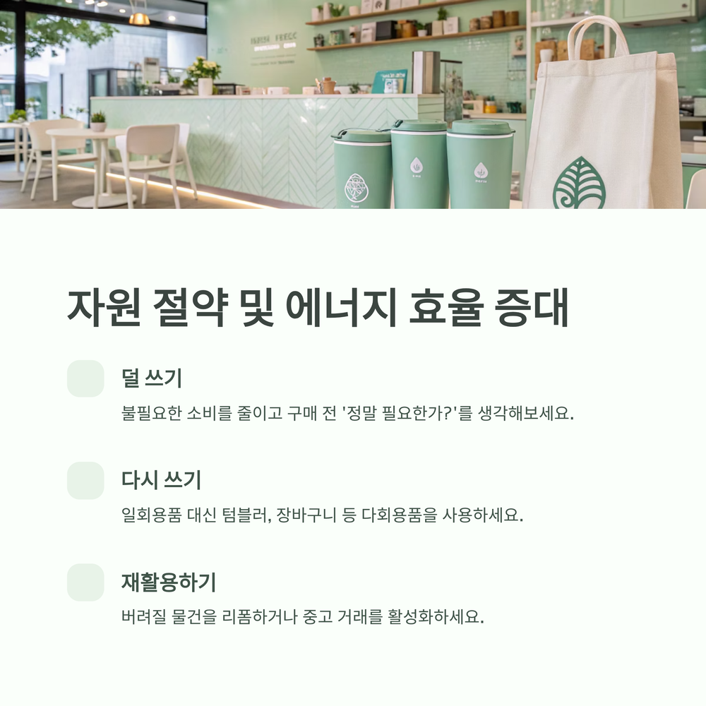 - 자원/에너지 절약: 불필요한 소비를 줄이고 재사용/재활용을 통해 유한한 지구 자원을 보호하고 에너지 낭비를 줄입니다.