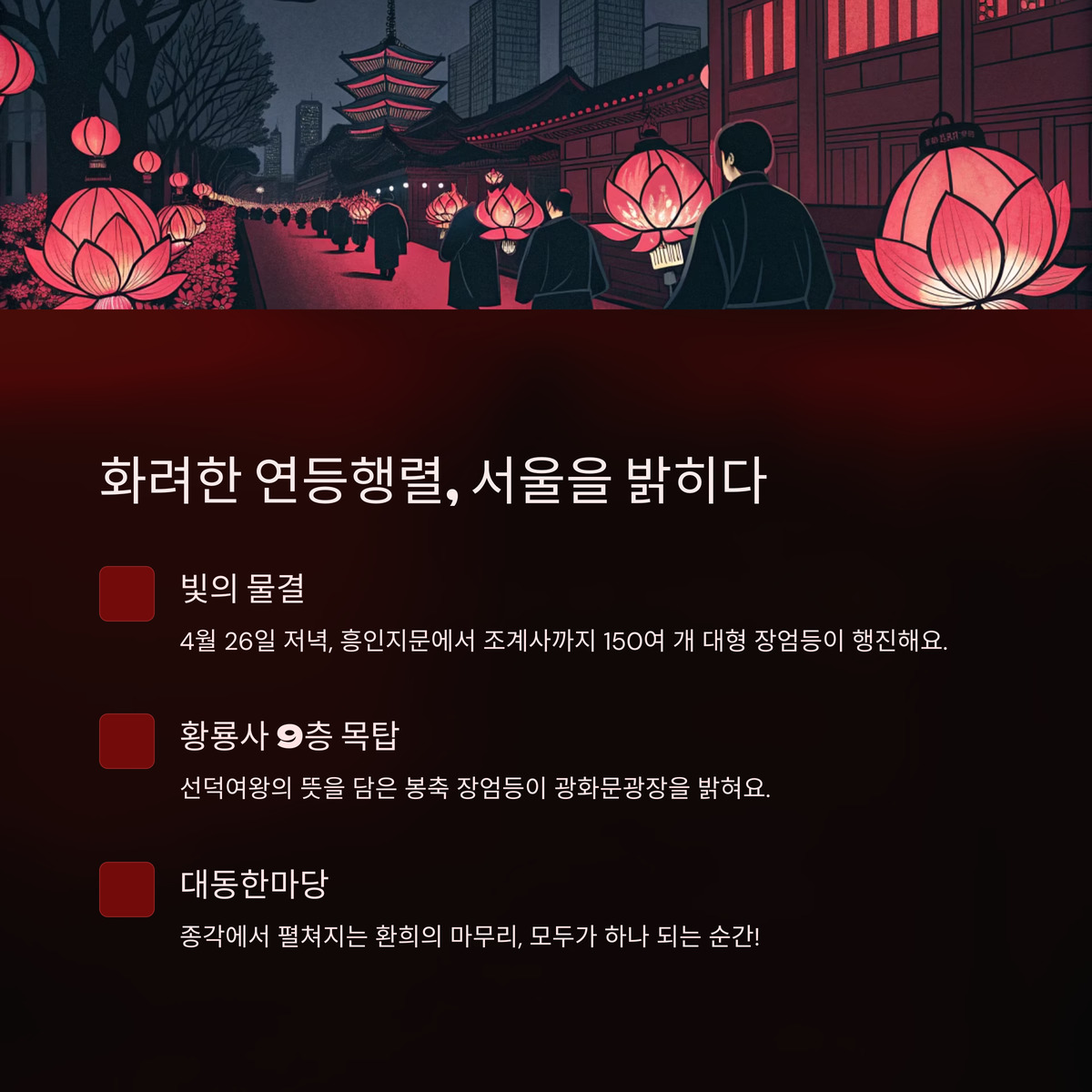 연등놀이는 연등회의 핵심 메시지인 화합과 환희를 가장 잘 보여줘요. 서울의 밤을 밝히며 하나 되는 이 순간은 누구나 행복해지는 마법 같은 시간이랍니다.