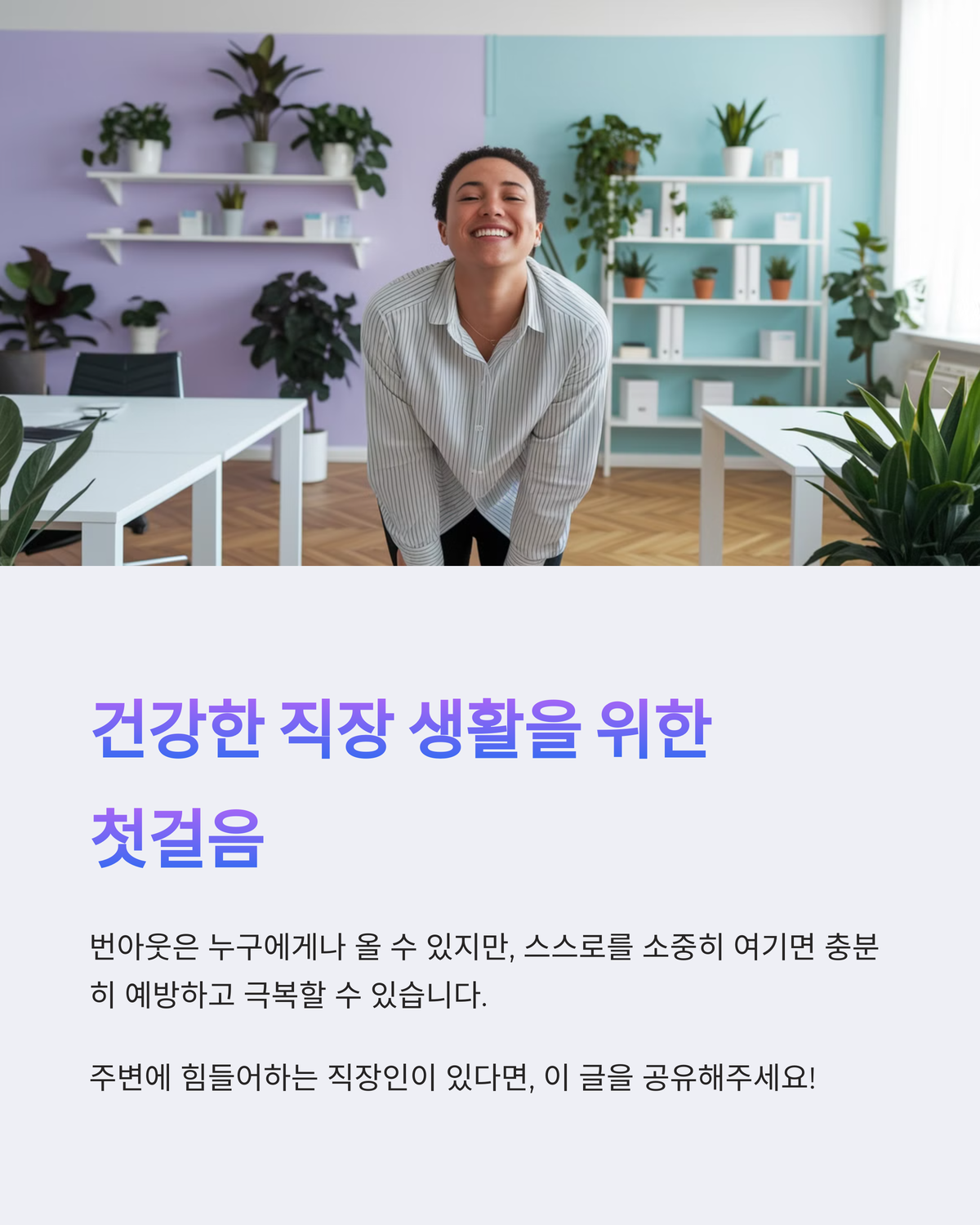 번아웃은 누구에게나 올 수 있지만, 스스로를 소중히 여기고 균형 잡힌 삶을 추구하면 충분히 예방하고 극복할 수 있습니다. 혹시 주변에 힘들어하는 직장인이 있다면, 이 글을 공유해서 함께 번아웃을 예방하는 방법을 찾아보는 건 어떨까요?