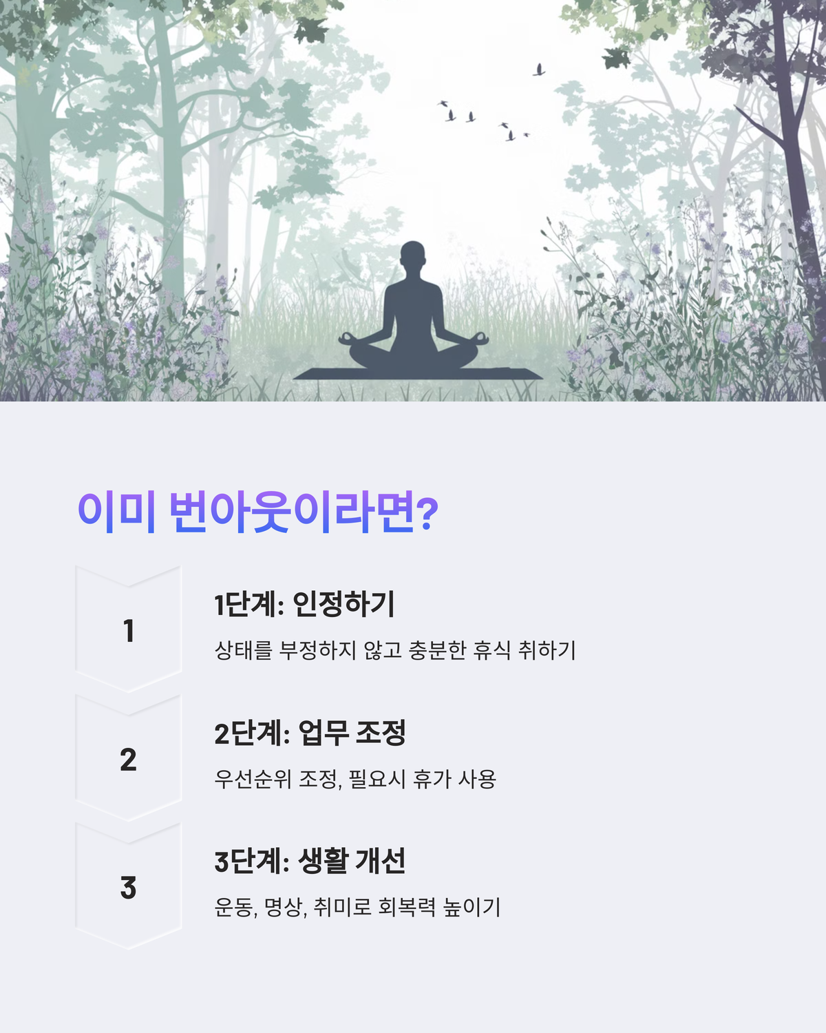 | 1단계: 번아웃 인정하기 | 내 상태를 부정하지 않고, 충분한 휴식을 취함 |