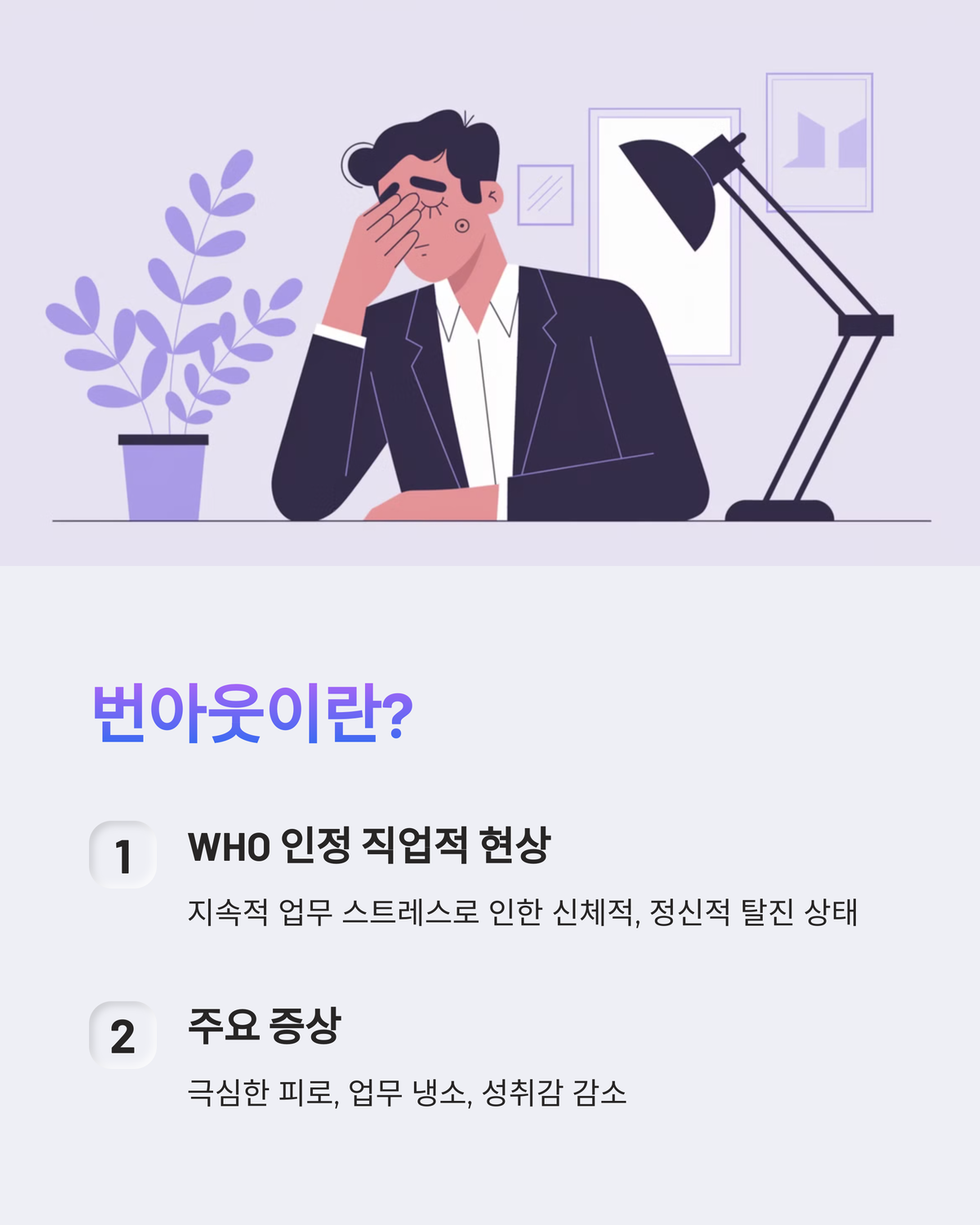 번아웃(Burnout)이란 지속적인 업무 스트레스와 과로로 인해 신체적, 정신적 탈진 상태에 이르는 것을 말합니다. 단순한 피로감과는 다르게, 번아웃은 장기적인 무기력감, 감정적 소진, 직무에 대한 부정적 태도를 동반하는 것이 특징이죠.