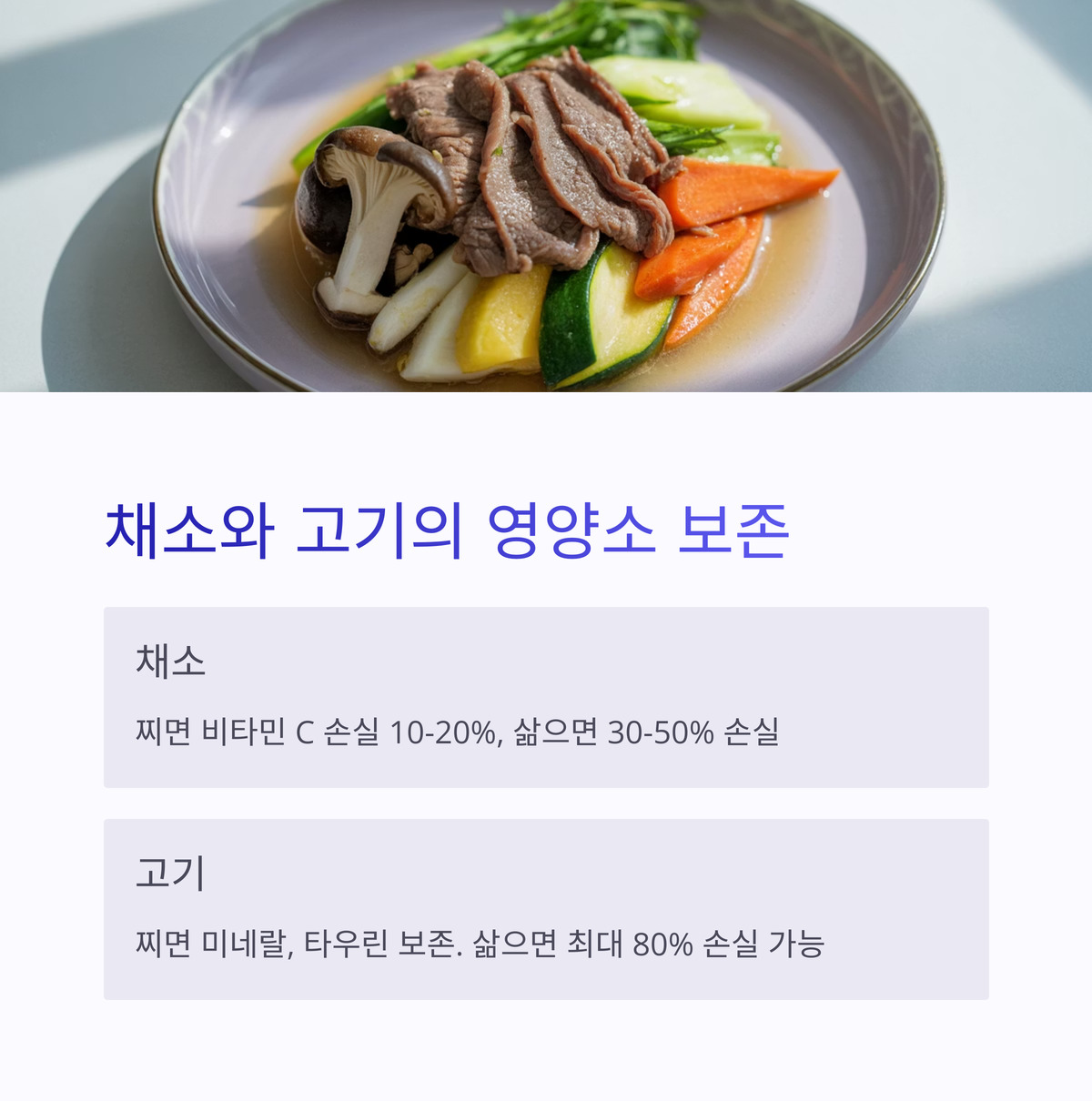 고기를 조리할 때도 찌기와 삶기의 영양소 비교가 중요해요. 삶기는 고기를 물에 담가 익히기 때문에 단백질은 크게 손실되지 않지만, 비타민 B12나 철분 같은 미네랄이 물로 빠져나갈 수 있죠. 특히 장시간 삶으면 타우린(고기에 많은 아미노산)의 50~80%가 손실될 수 있어요.