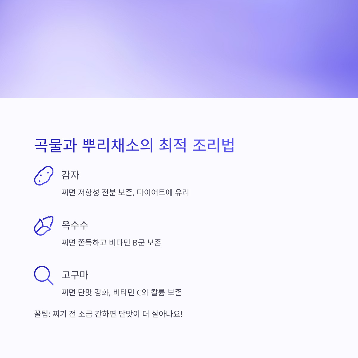 고구마, 감자, 옥수수 같은 뿌리채소와 곡물도 찌기와 삶기로 조리하면 영양소 보존에 차이가 생겨요. 고구마를 삶으면 비타민 C와 칼륨이 물에 녹아나가지만, 찌면 이런 손실이 적고 단맛도 더 강해지죠.