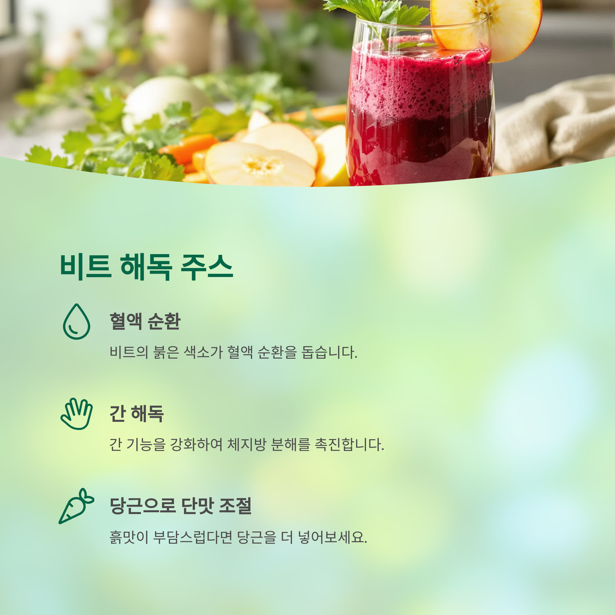 비트는 혈액 순환을 돕고 간 해독 기능을 강화하는 데 탁월해요. 비트 해독 주스는 체지방을 분해하는 데 도움을 주며, 붉은 색소 덕에 눈도 즐거운 스무디예요. 사과와 당근을 함께 넣으면 단맛이 더해져 맛도 좋아지죠.