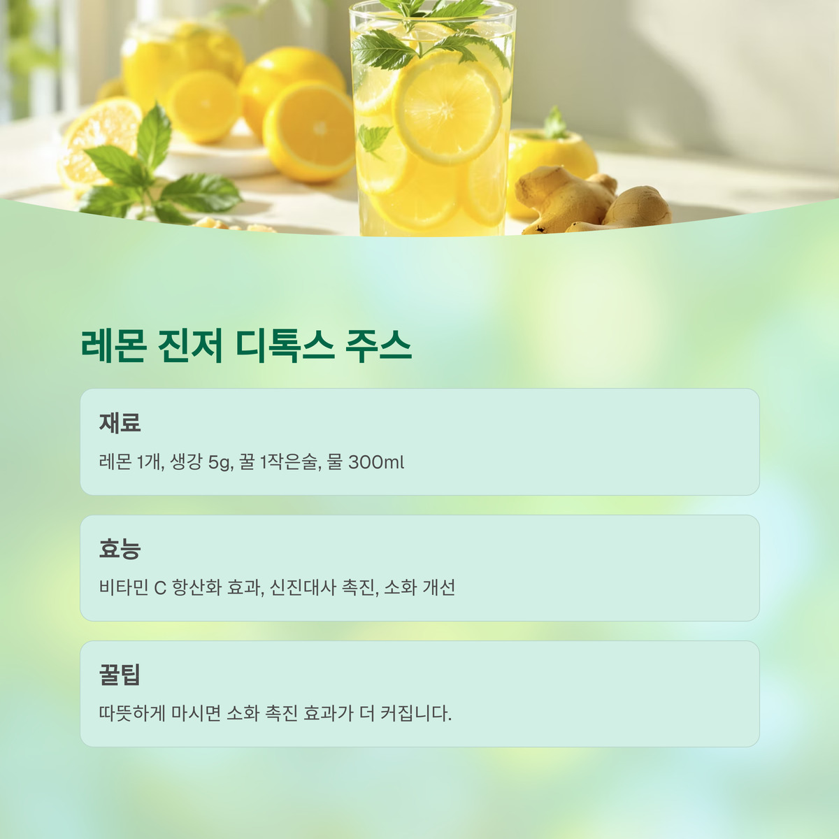 만드는 법은 간단해요. 레몬 1개(약 50ml 즙), 생강 1작은 조각(껍질 벗겨 5g), 꿀 1작은술, 물 300ml를 믹서기에 넣고 곱게 갈아주세요. 꿀은 천연 단맛을 더해 마시기 쉽게 해주죠. 이 주스는 소화불량이나 피로감이 있을 때도 효과적이랍니다.