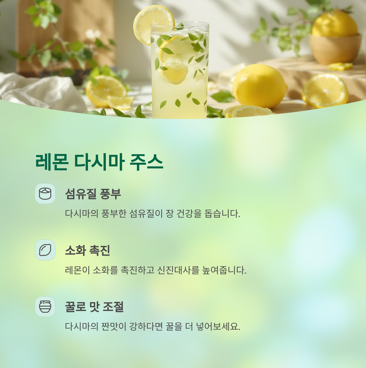 레몬 1개(50ml 즙), 말린 다시마 5g(물에 10분 불린 후), 물 300ml, 꿀 1작은술을 믹서기에 넣고 갈아주세요. 다시마는 곱게 갈리도록 불린 후 잘 헹궈야 비린내가 없어요. 이 주스는 점심이나 저녁 식사 30분 전에 마시면 좋아요.