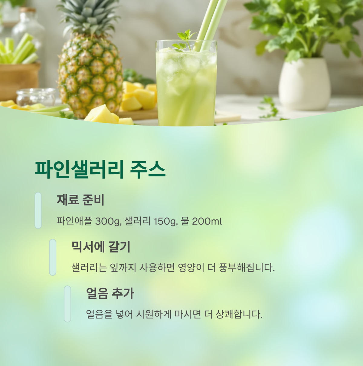 파인애플과 샐러리가 만난 주스는 소화력을 높이고 체지방 감량을 돕는 훌륭한සඅ 파인샐러리 주스는 비타민과 식이섬유가 풍부해 독소 배출과 신진대사를 촉진해요. 파인애플의 단맛이 샐러리의 쌉쌀한 맛을 잡아줘 마시기 편하죠.