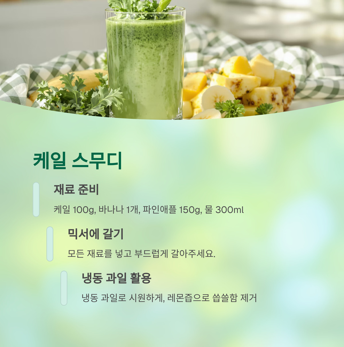 케일은 식이섬유와 항산화 물질이 가득한 슈퍼푸드예요. 케일 스무디는 포만감이 높아 다이어트 중 허기를 다스리는 데 딱이죠. 바나나와 파인애플을 추가하면 상큼한 맛으로 누구나 쉽게 즐길 수 있어요.