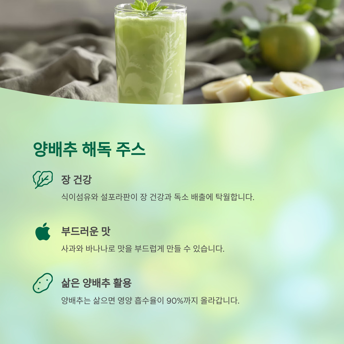 양배추는 식이섬유와 설포라판이 풍부해 장 건강과 독소 배출에 탁월해요. 양배추 해독 주스는 체지방 감량을 돕고 변비 예방에도 효과적이죠. 사과와 바나나를 넣으면 부드러운 맛이 더해져요.