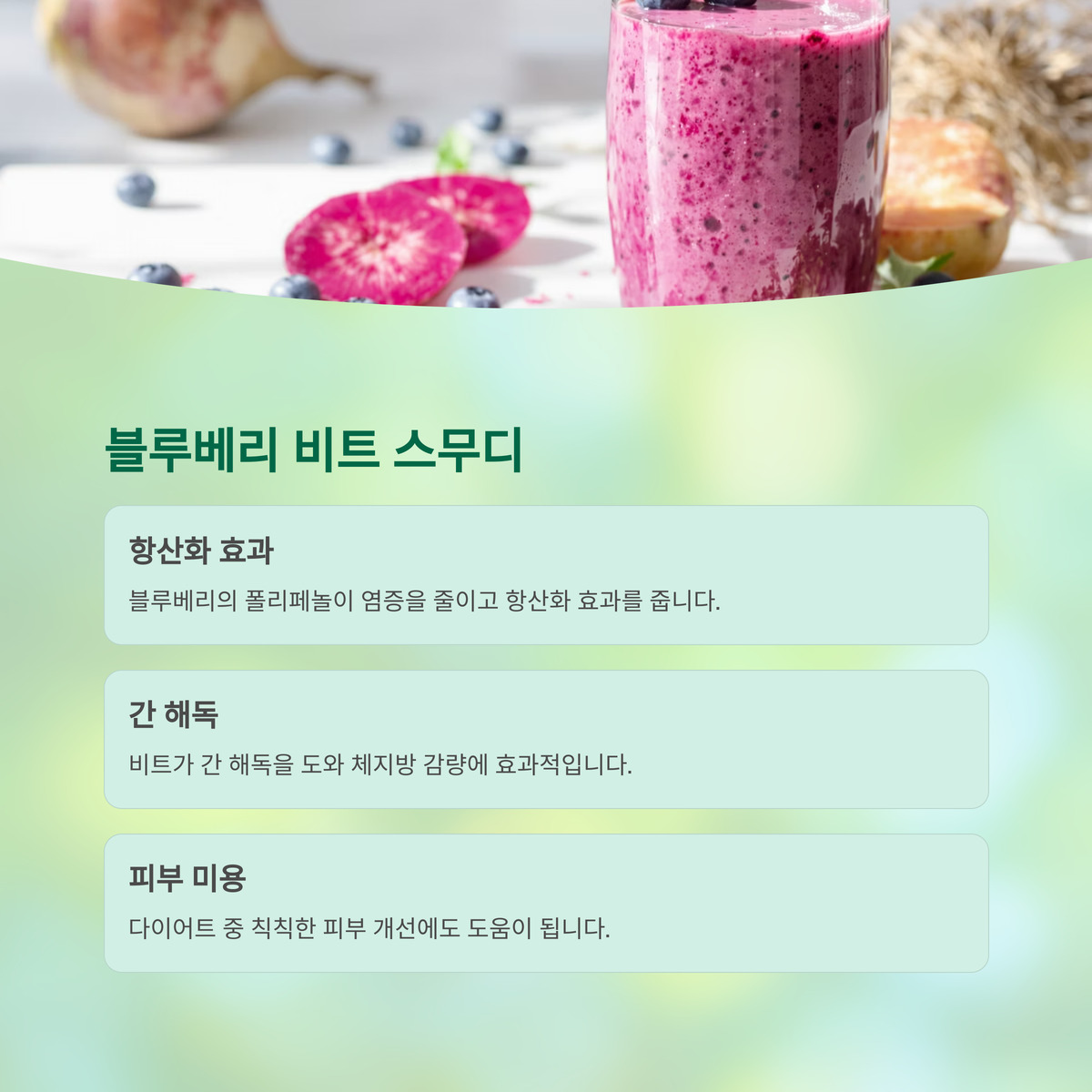 블루베리와 비트가 어우러진 스무디는 항산화 효과와 체지방 감량을 동시에 노릴 수 있어요. 블루베리는 폴리페놀이 풍부해 염증을 줄이고, 비트는 간 해독을 돕죠. 상큼한 맛으로 디톡스 초보자도 부담 없이 즐길 수 있답니다.