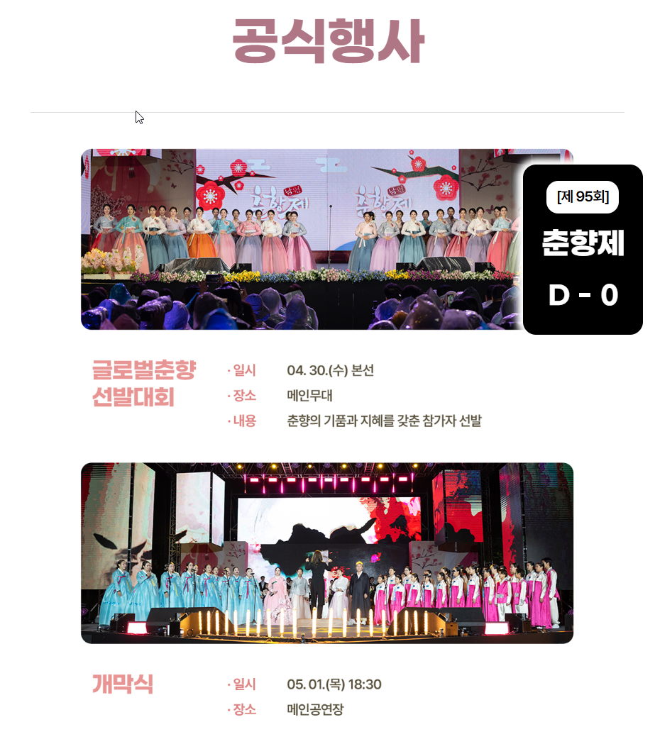 춘향제의 하이라이트는 단연 글로벌 춘향선발대회예요. 1950년부터 시작된 이 행사는 전통미와 교양을 겸비한 인물을 선발하며, 2024년부터 해외 참가자까지 포함해 글로벌 무대로 확장됐죠. 4월 30일 요천로 특설무대에서 펼쳐지는 본선에선 진·선·미·정·숙·현과 글로벌 뮤즈 등 수상자들이 남원 홍보대사로 활약해요.