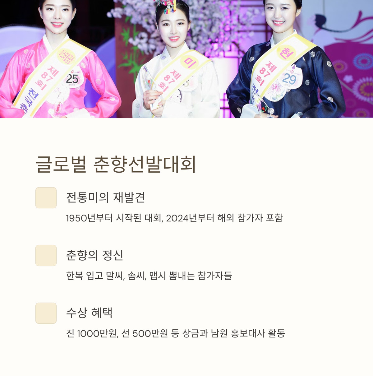참가자들은 한복을 입고 말씨, 솜씨, 맵시를 뽐내며 춘향의 정신을 현대적으로 재해석하죠. 이 대회의 열기를 현장에서 느껴보세요!