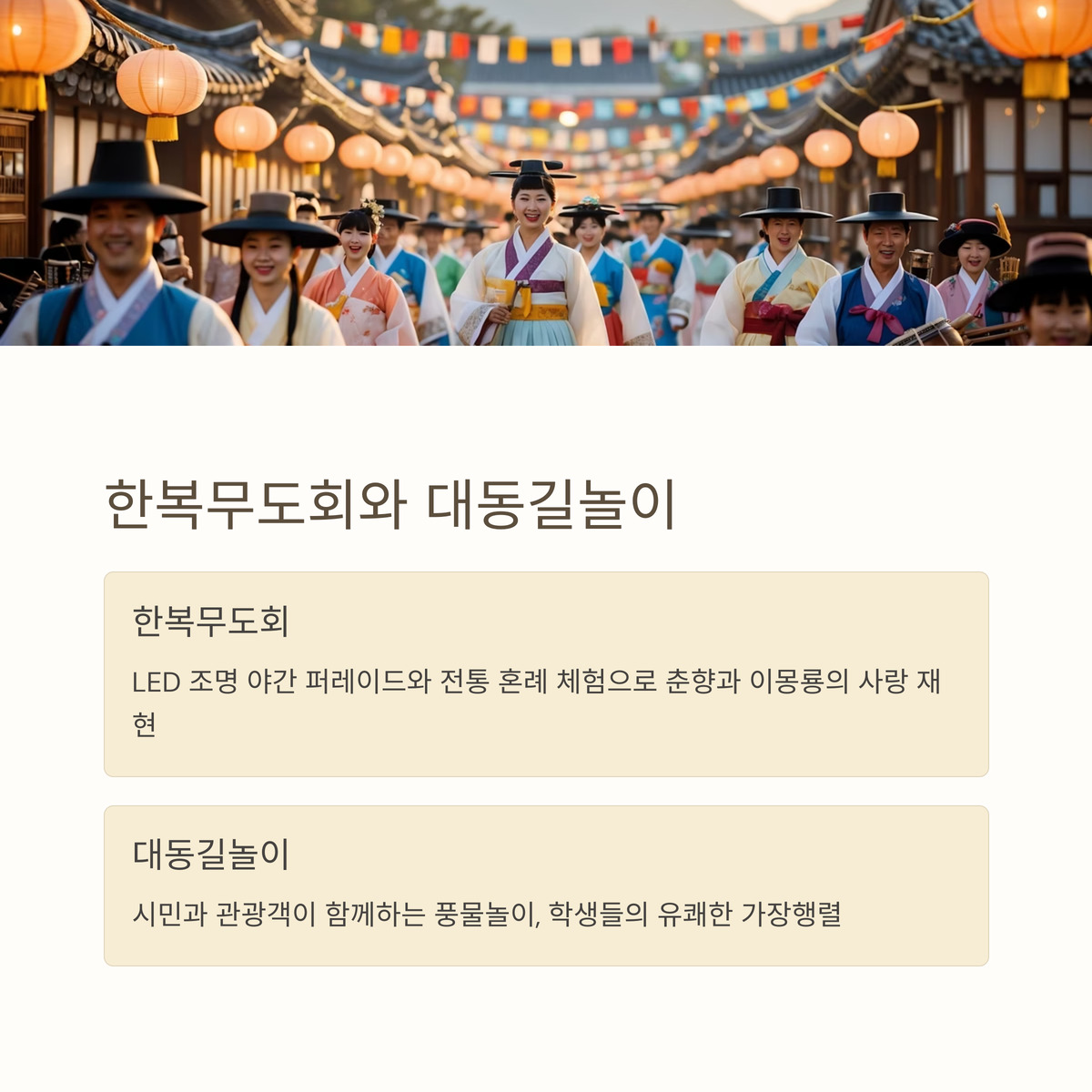 대동길놀이는 춘향제의 대표적인 시민 참여 프로그램이에요. 남원시민과 관광객이 함께 풍물놀이, 사물놀이, 가장행렬에 참여하며 거리를 활기차게 누비죠. 특히, 학생들이 성춘향과 이몽룡으로 분장해 꽃마차를 타고 퍼레이드하는 모습은 관객들의 환호를 받을 만큼 유쾌해요!