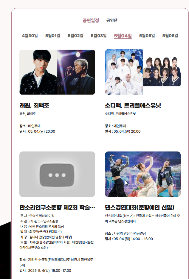 춘향 국악대전은 춘향제의 전통 예술 프로그램으로, 판소리와 국악 공연의 진수를 보여줘요. 전국에서 모인 국악인들이 광한루원 무대에서 춘향가와 다양한 전통 음악을 선보이며 관객을 매료시키죠. 젊은 층을 위해 K-POP 커버댄스와 퓨전 뮤지컬도 함께 펼쳐져요.