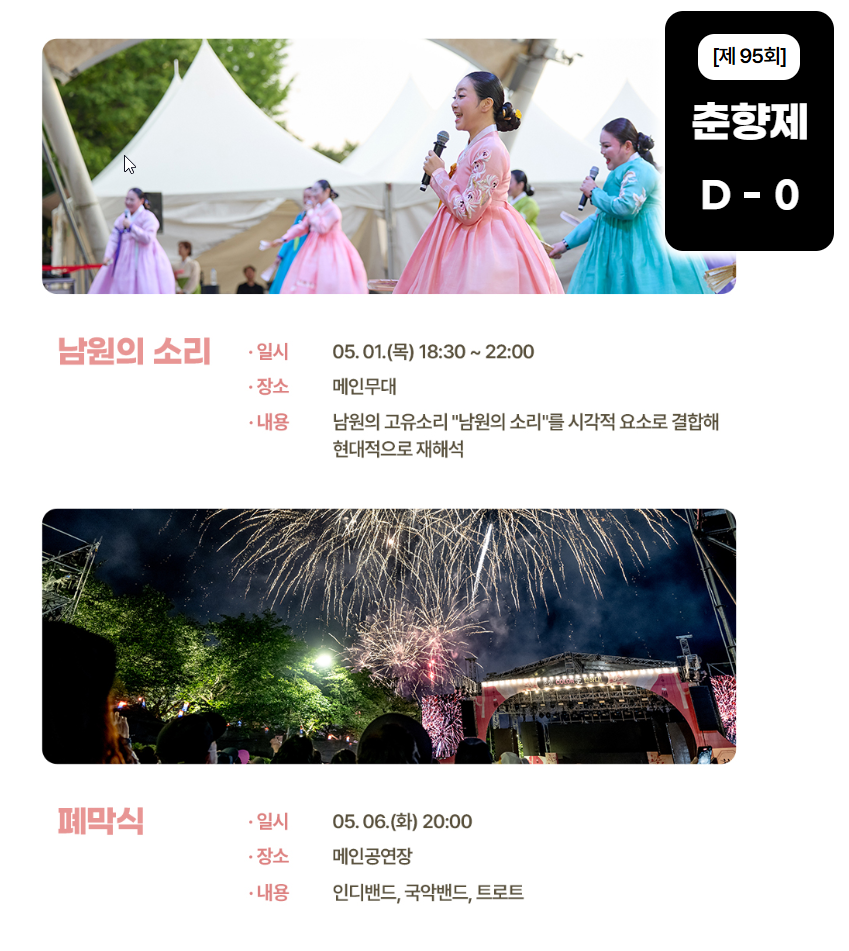 춘향제는 단순한 지역 축제가 아니에요. 춘향의 소리를 통해 전통과 현대, 지역과 세계가 만나는 특별한 무대죠. 글로벌 춘향선발대회, 한복무도회, F&B 존, 춘향 포토존까지, 남원의 매력을 무료로 만끽할 수 있는 기회예요.