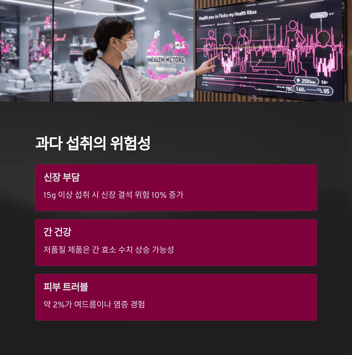 콜라겐 부작용은 과다 섭취에서도 나타날 수 있어요. 하루 권장량은 보통 2.5~10g인데, 15g 이상 먹으면 신장에 부담을 줄 수 있다는 연구가 있어요. 2024년 영양학 저널에 따르면, 고용량 콜라겐이 신장 결석 위험을 10% 정도 높일 수 있다고 나왔어요. 적당히 먹는 게 안전성을 지키는 길이에요.