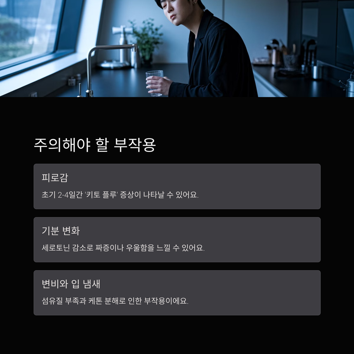 특히 처음 2~4일은 ‘키토 플루’라고 감기 비슷한 증상 느낄 수도 있죠. 근데 몸이 적응하면 괜찮아진다고 하니까 조금만 참아보세요.