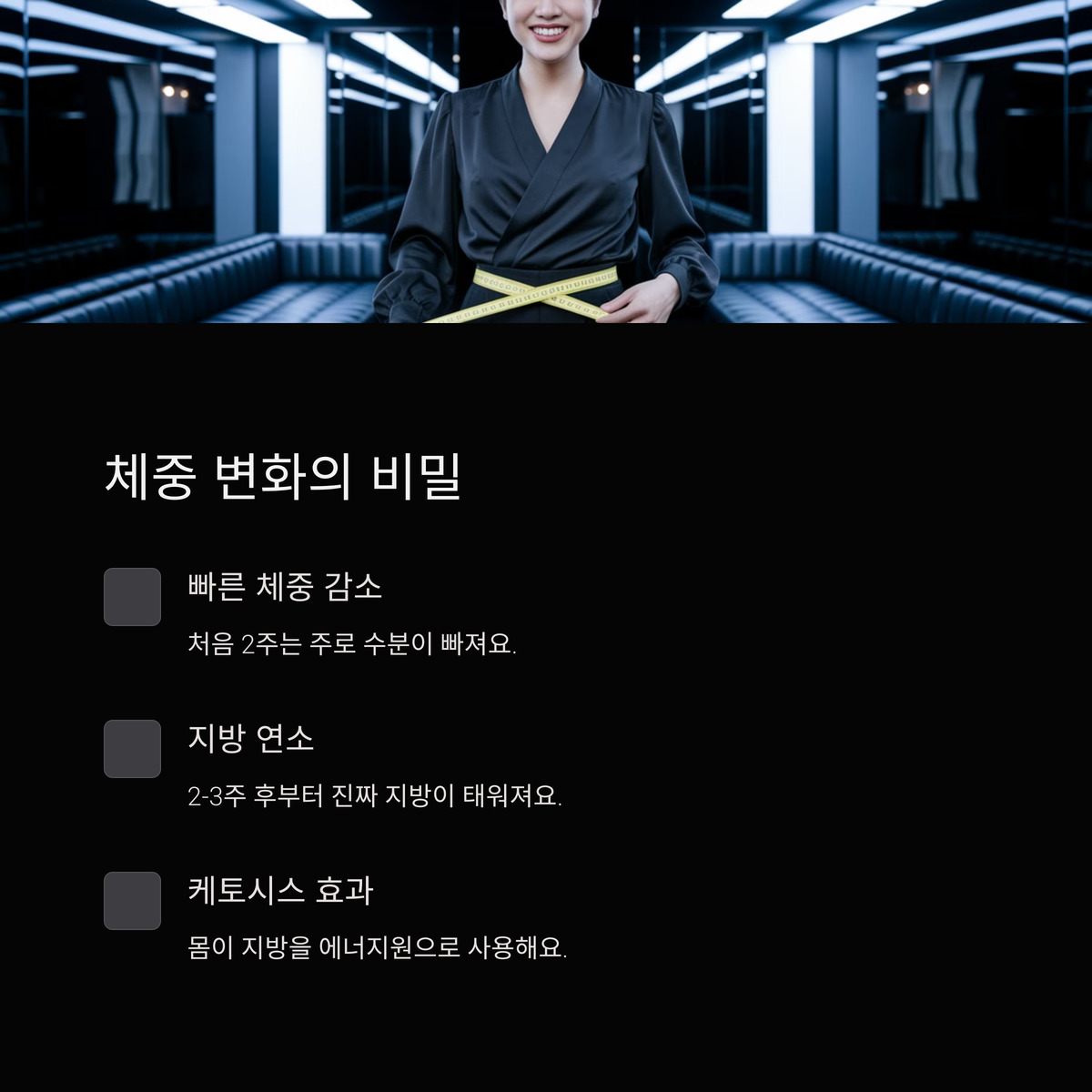 글리코겐 하나당 물 3g 정도 붙어 있으니까, 이게 줄어들면 체중이 확 내려가죠. 근데 진짜 지방 태우는 건 2~3주 지나야 시작돼요. 그러니까 처음엔 급격한 변화 보고 좋아하다가 살짝 놀랄 수도 있어요.