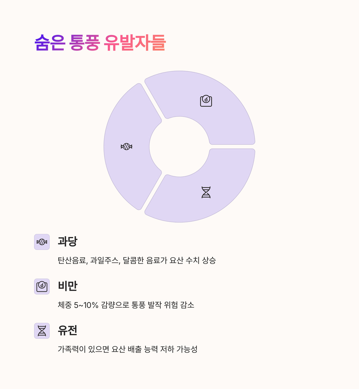대사증후군(고혈압, 당뇨, 고지혈증, 비만)은 통풍 원인과 밀접한 관련이 있어요. 특히 인슐린 저항성은 요산 배출을 억제해 통풍 위험을 높이죠. 통풍 환자의 절반 이상이 대사증후군을 동반한다고 해요.