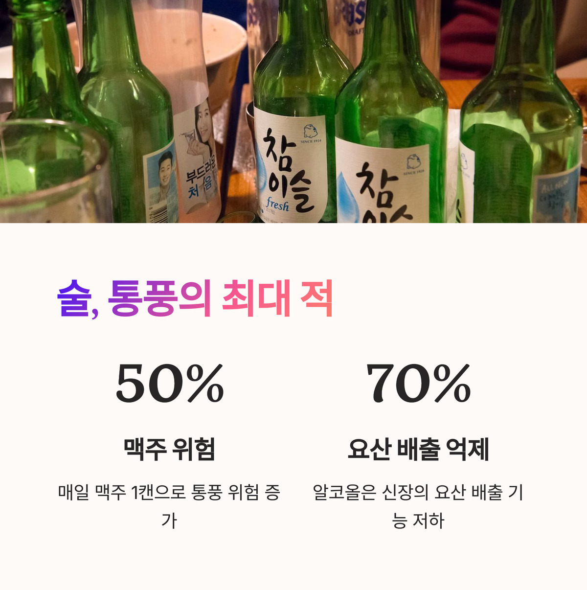 술은 통풍 원인 중에서도 악명 높은 주범이에요. 알코올은 요산 생성을 늘리고, 신장에서 요산 배출을 억제하죠. 특히 맥주는 퓨린 함량이 높아 통풍 발작 위험을 크게 높여요. 연구에 따르면, 매일 맥주 1캔을 마시면 통풍 위험이 50%나 증가한다고 해요.