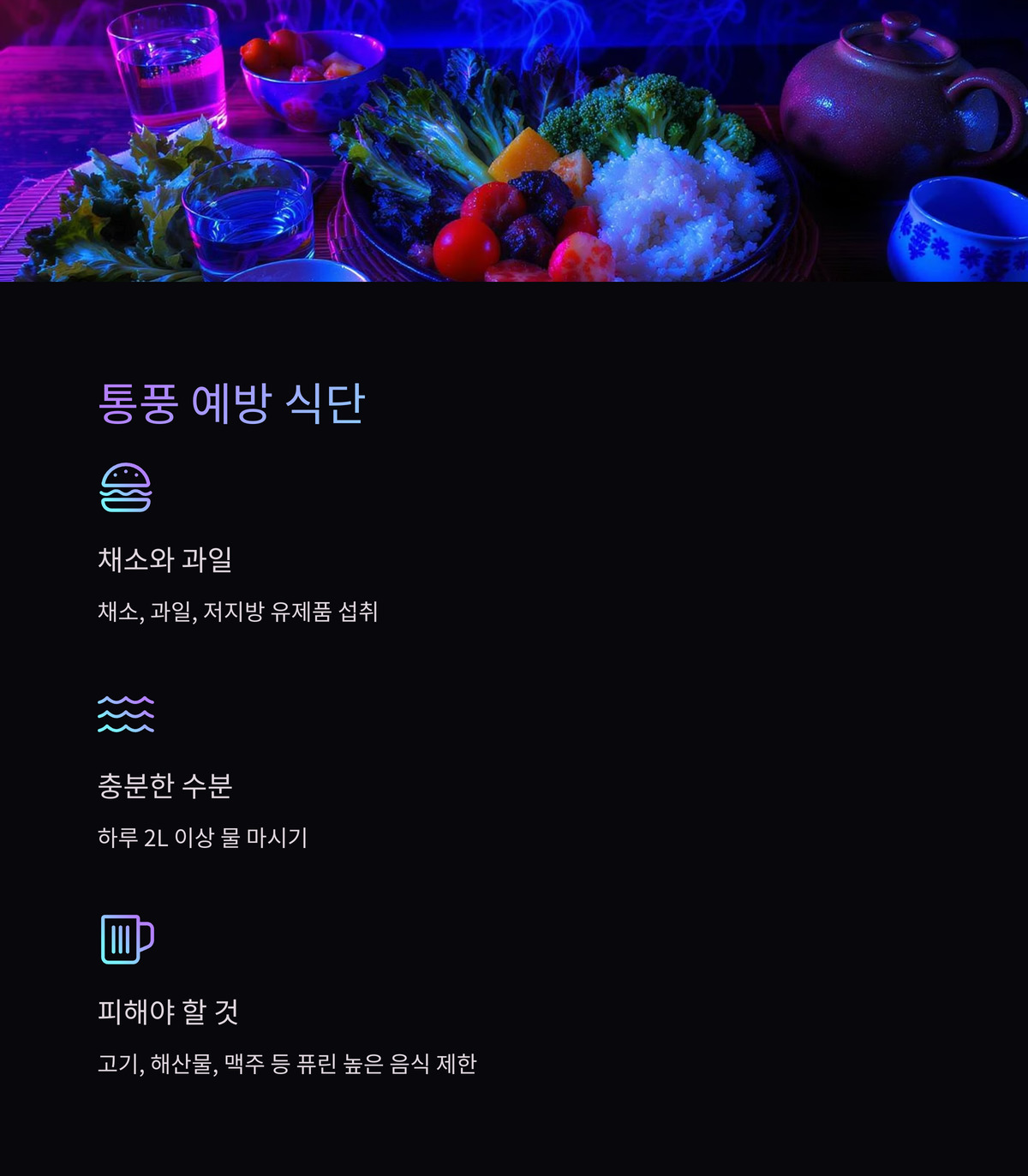 체중 관리도 중요해요. 비만은 통풍 위험을 높이니, 정상 체중을 유지하도록 노력하세요. 단, 급격한 체중 감소는 요산 수치를 올릴 수 있으니 천천히 감량하세요. 하루 루틴 예시: - 아침: 저지방 요거트, 사과, 오트밀 - 점심: 현미밥, 브로콜리, 구운 닭가슴살 - 간식: 바나나, 물 500mL - 저녁: 해조류 샐러드, 찐 고구마, 생선