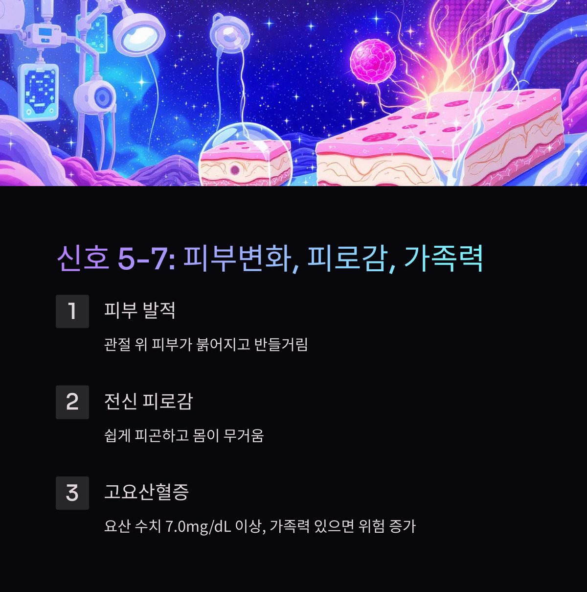 통풍 초기증상을 자가진단할 때 중요한 신호는 고요산혈증 병력이나 가족력이에요. 혈액 검사에서 요산 수치가 7.0mg/dL 이상이라면 고요산혈증으로, 통풍 위험이 높아져요. 가족 중 통풍 환자가 있다면 유전적 요인으로 발병 가능성이 더 높죠.