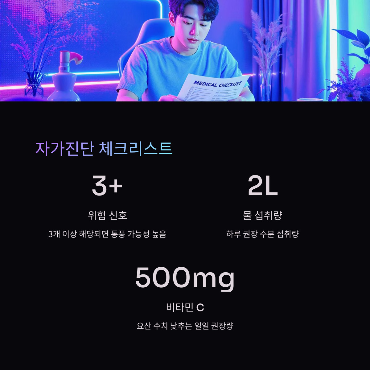 위 항목 중 3개 이상 해당된다면 통풍 가능성이 높아요. 정확한 진단을 위해 병원에서 혈액 검사나 관절액 검사를 받아보세요.