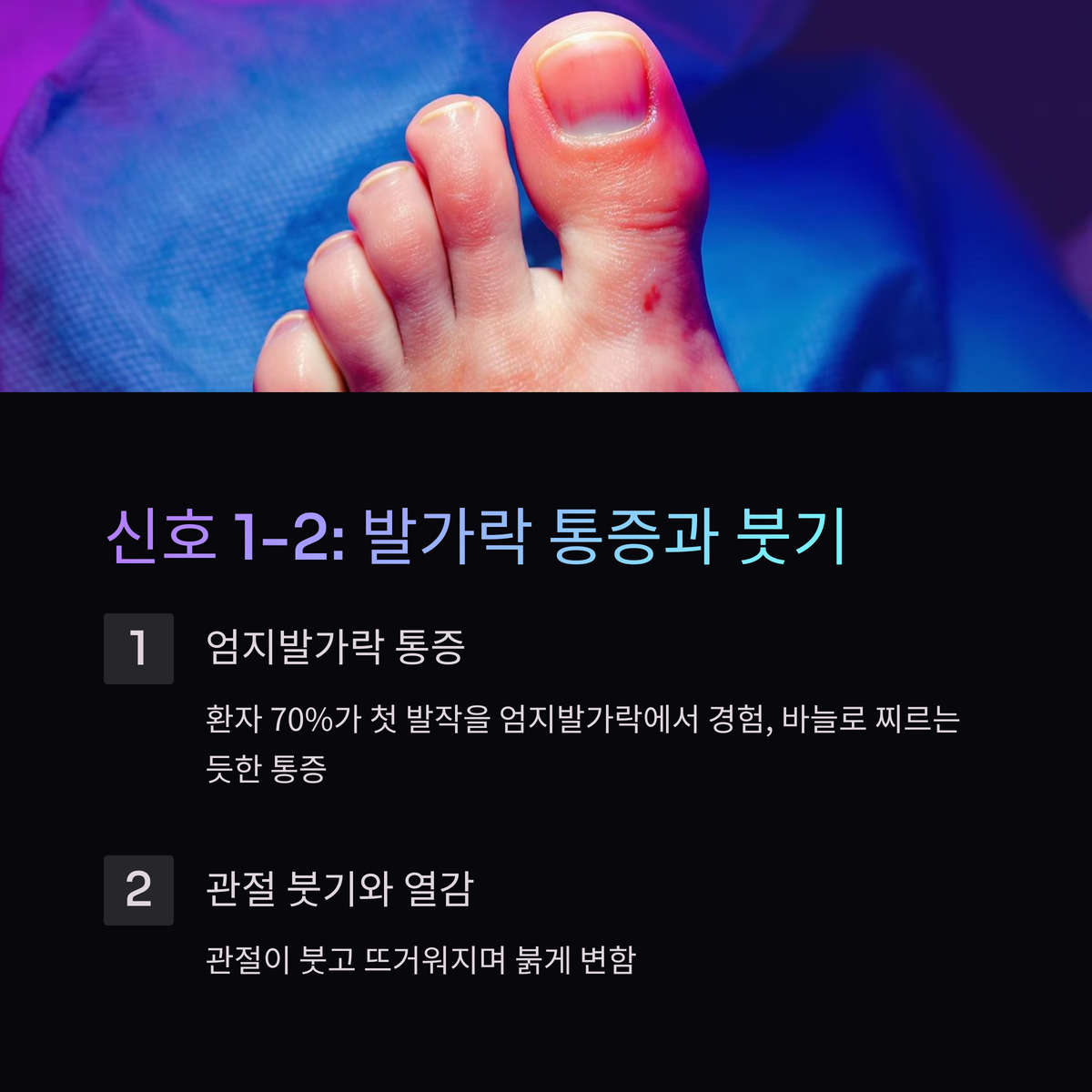 서울아산병원 자료에 따르면, 통풍 환자의 70% 이상이 첫 발작을 엄지발가락에서 경험한다고 해요. 신발을 신거나 걷기 불편할 정도로 통증이 심하다면, 단순한 피로가 아니라 통풍 초기증상일 가능성이 높아요. 통증이 며칠 안에 사라져도 방심하지 마세요.