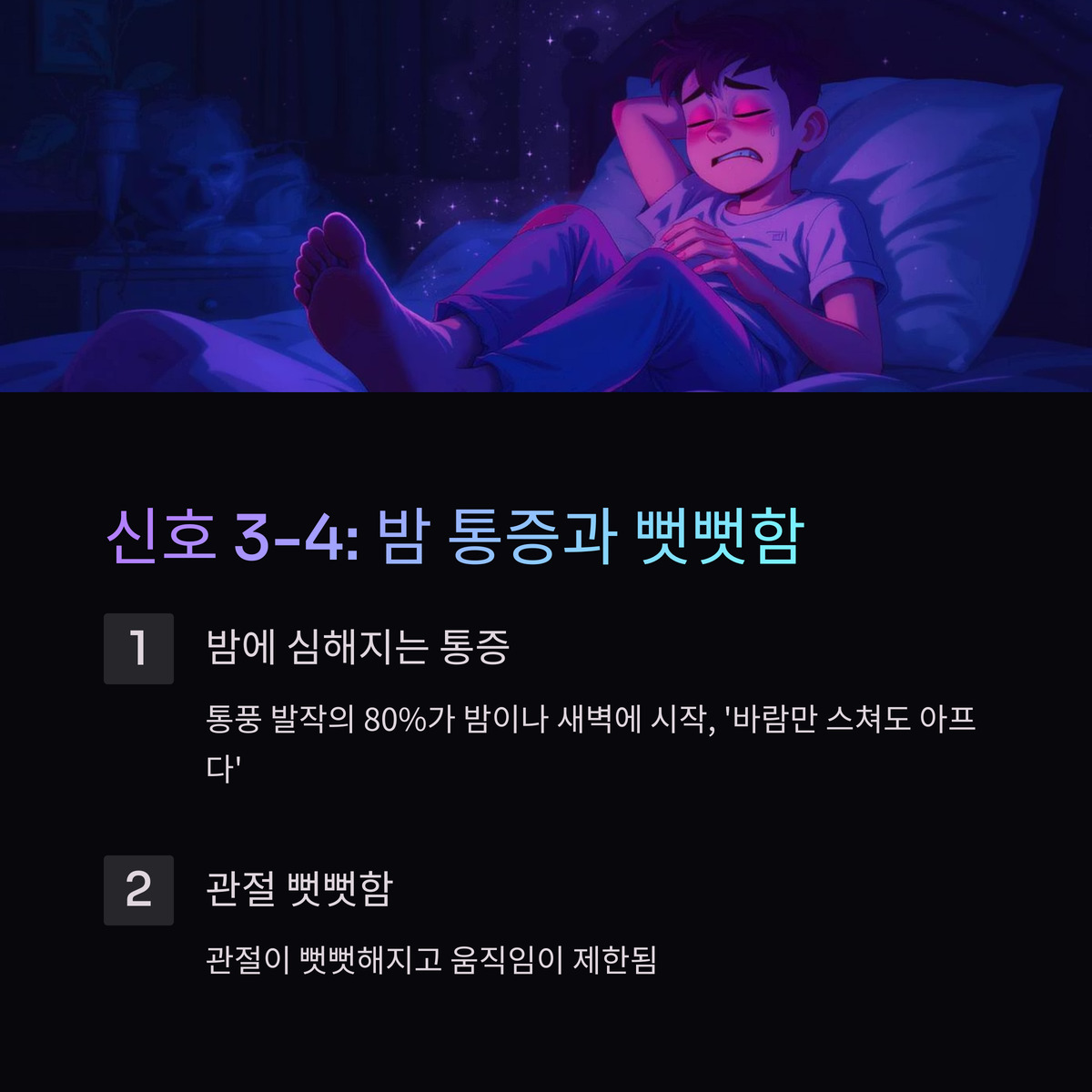 삼성서울병원 연구에 따르면, 통풍 발작의 80%가 밤이나 새벽에 시작된다고 해요. 이런 통증은 ‘바람만 스쳐도 아프다’고 할 만큼 극심할 수 있으니, 증상이 반복된다면 병원 방문을 계획하세요.