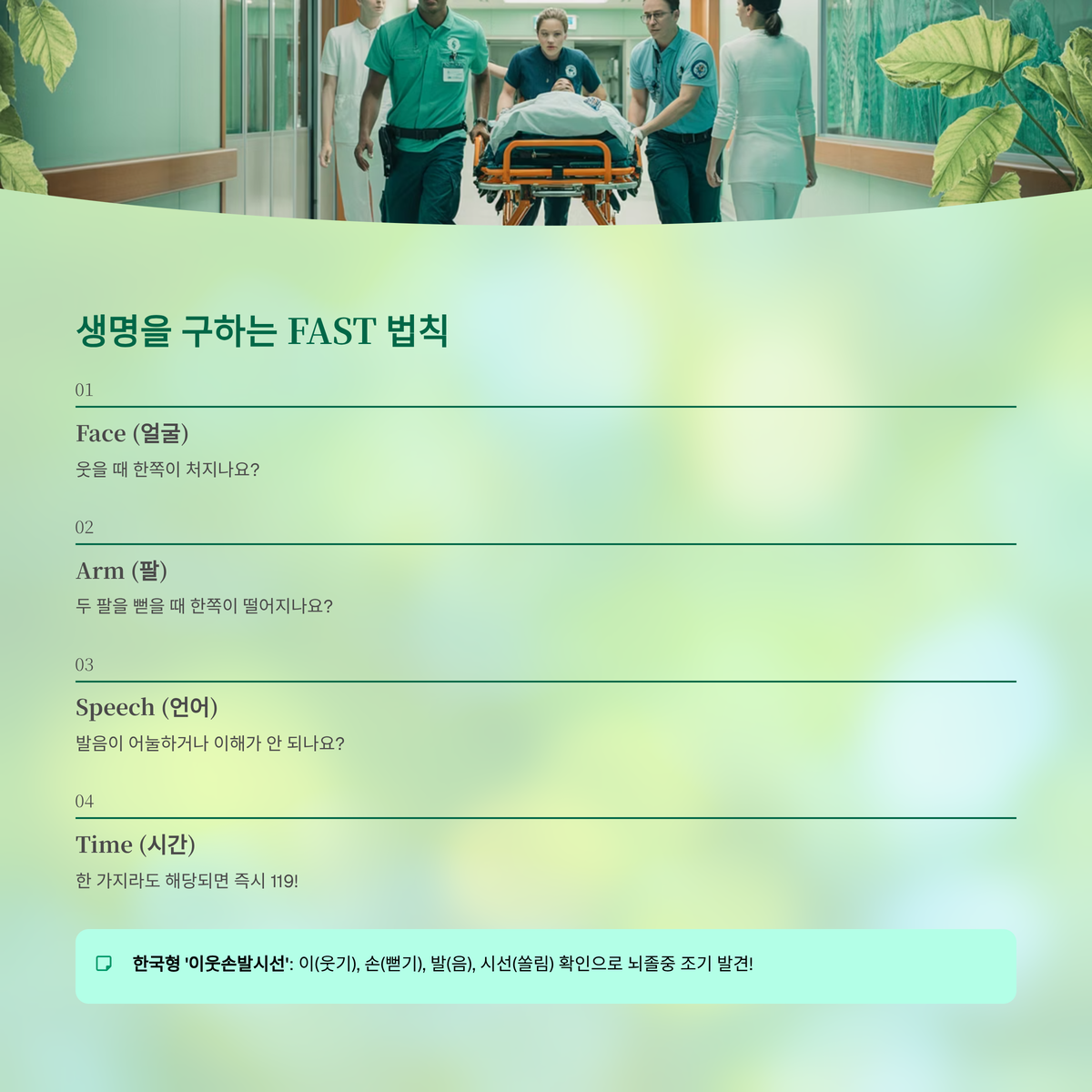 - T (Time): 한 가지 증상이라도 나타나면 즉시 119에 전화해야 할 시간!